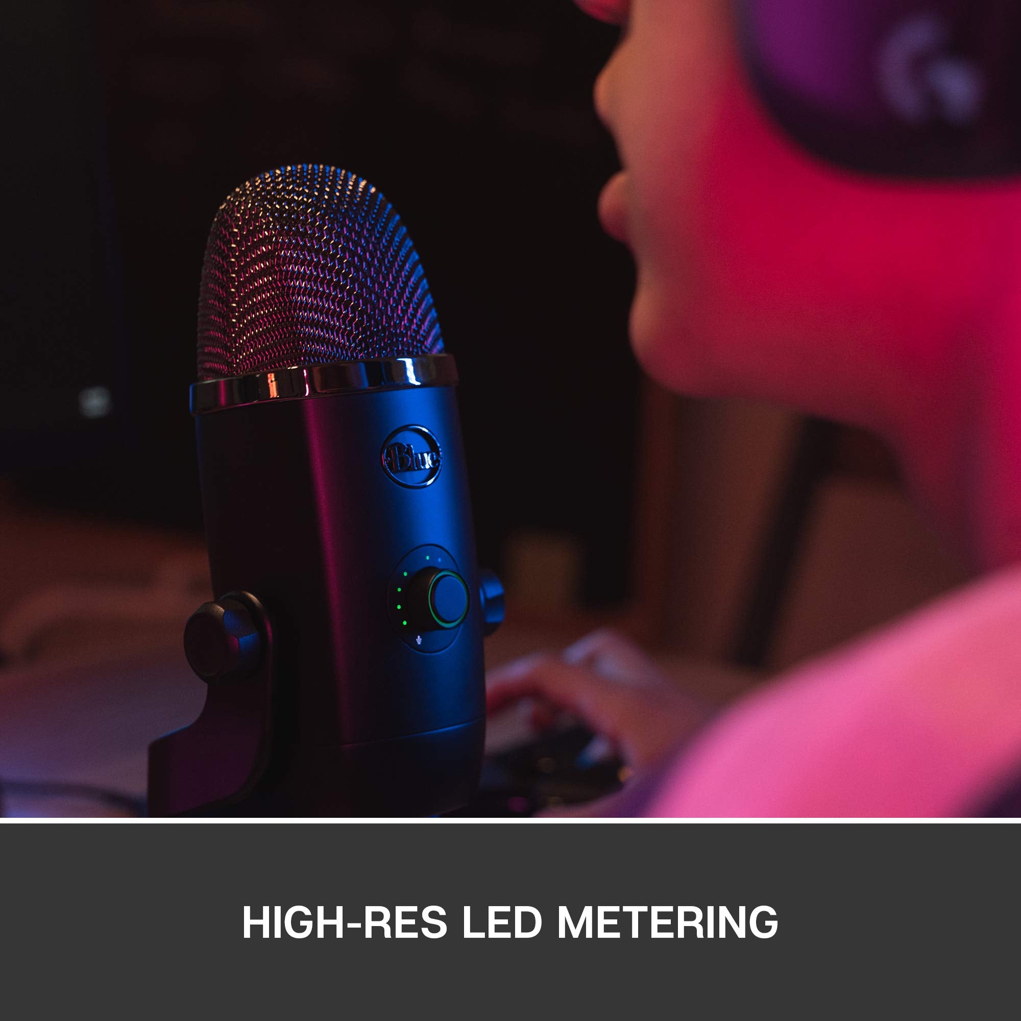- High-res LED metering - visualize your voice level with the Yeti x Microphone 11-segment LED meter. At a glance you can check if your voice level is too high or too low and adjust accordingly.