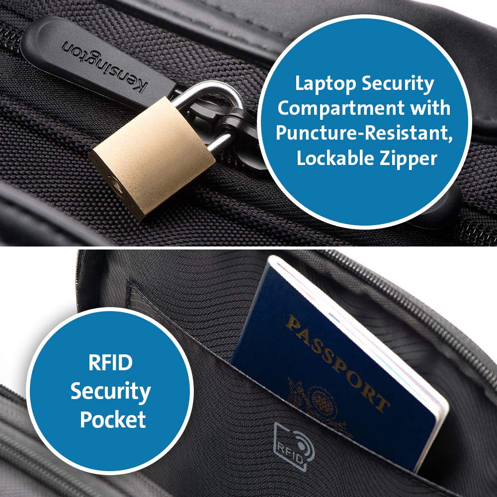 - Laptop security compartment with a puncture-resistant, lockable zipper secures your laptop or tablet from intrusion.