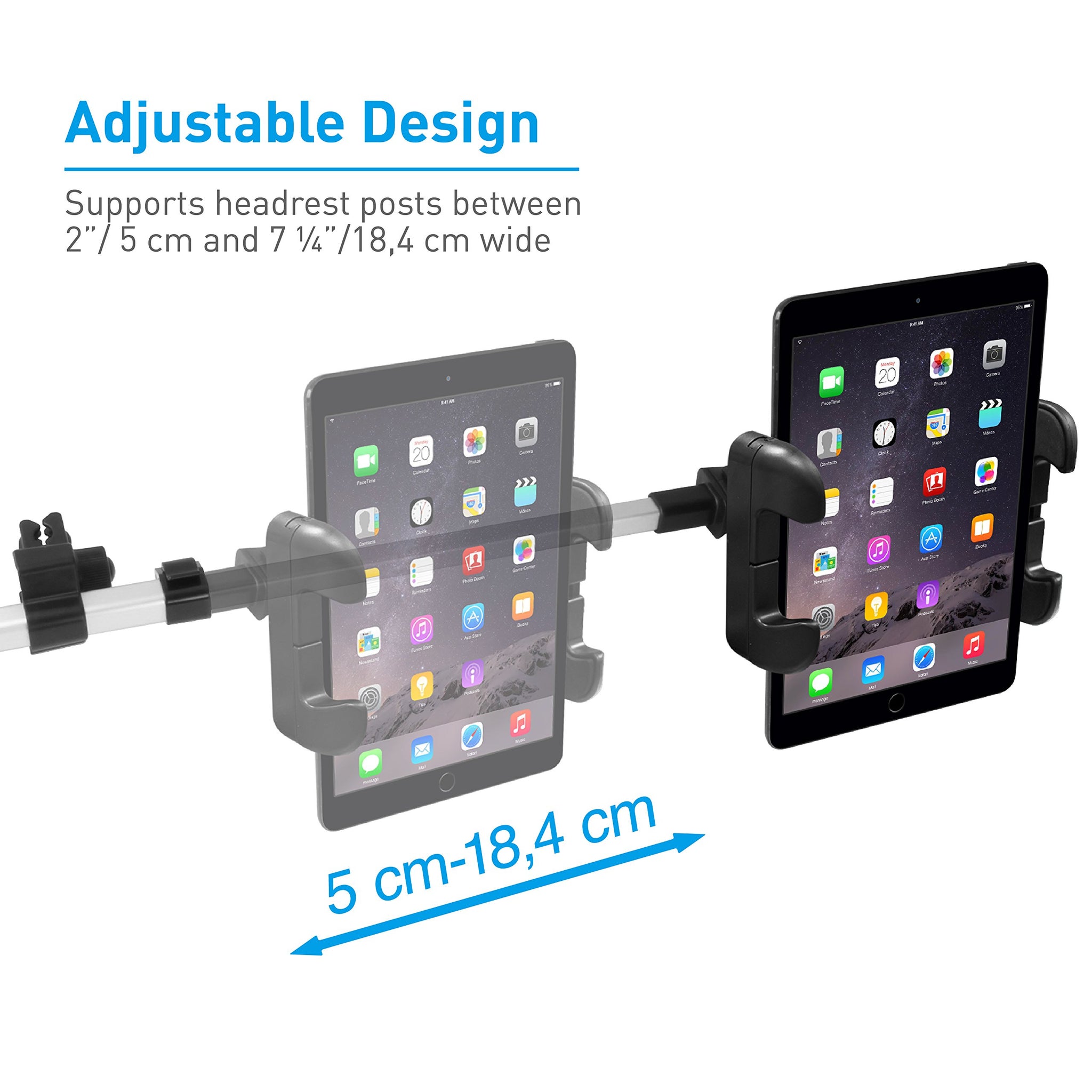 • YOUR PREFERRED ADJUSTABILITY: Choose having your tablet directly behind a car seat for a single passenger or in between the driver and passenger seats for multiple passengers. The ball-head also allows for different viewing angles and for 360° rotation.