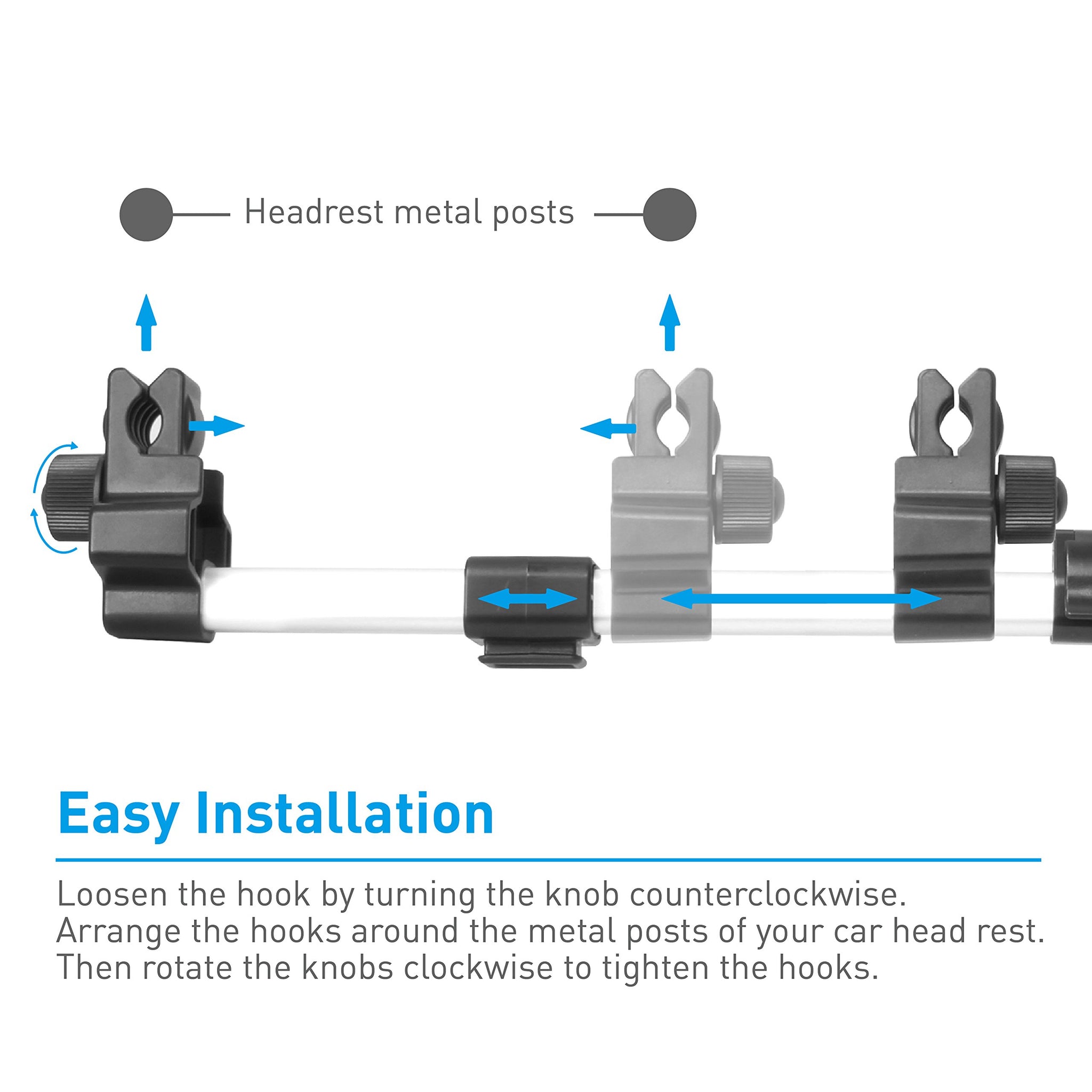• QUICK & EASY INSTALLATION: With no tools required, simply twist the knobs to quickly attach or detach the mount to most headrest posts (2" and 7.25" wide)