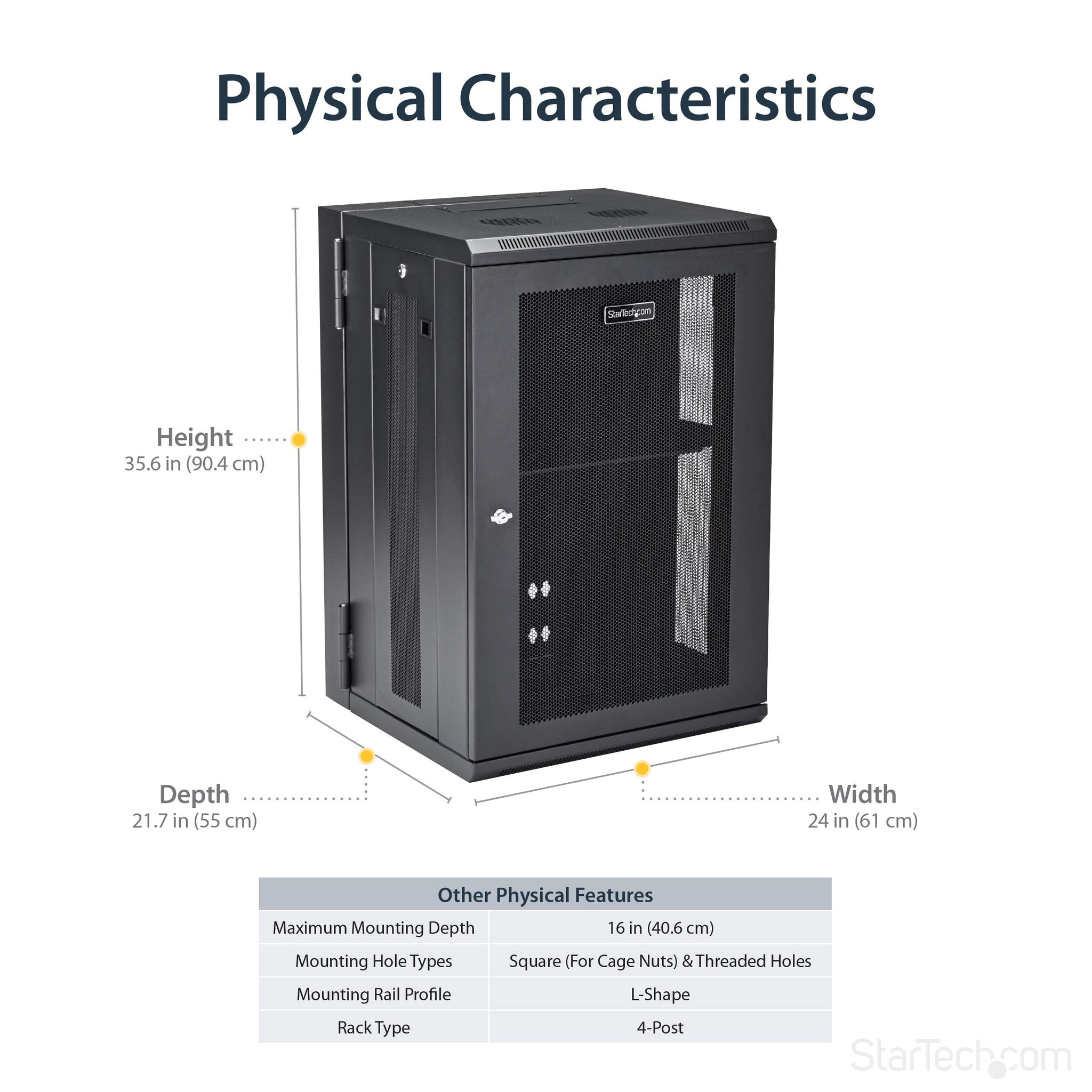 StarTech.com 18U Wall Mount Network Switch Cabinet - 4-Post Adjustable Depth (2" to 16") Fully Secure IT Cabinet w/ Cable Management 200lb / 90kg (RK1820WALHM)