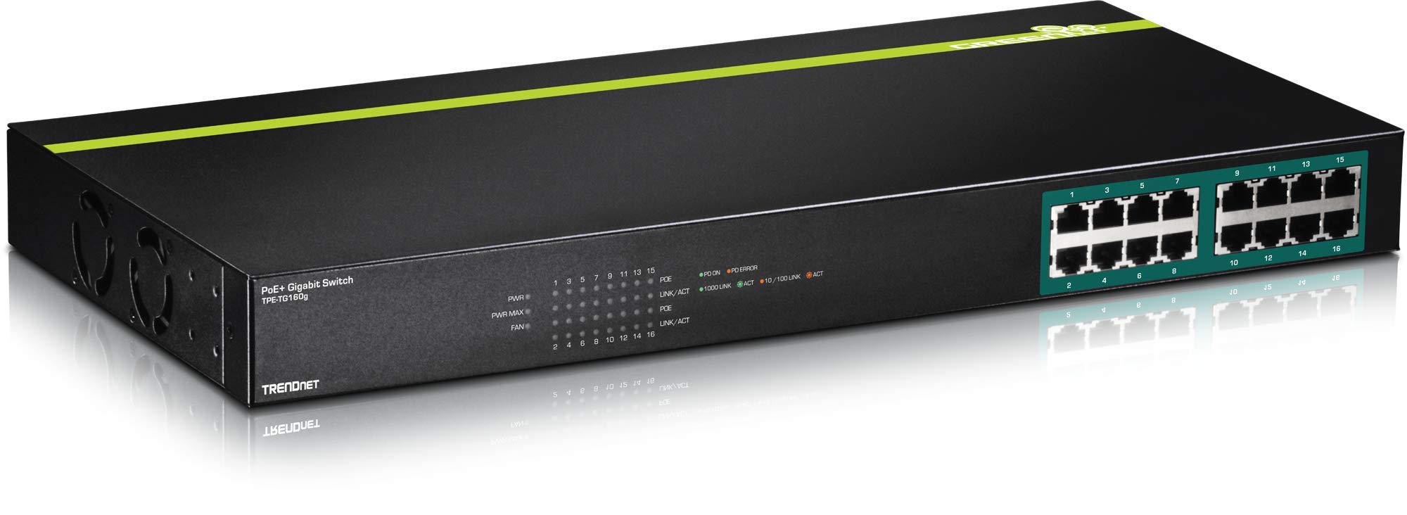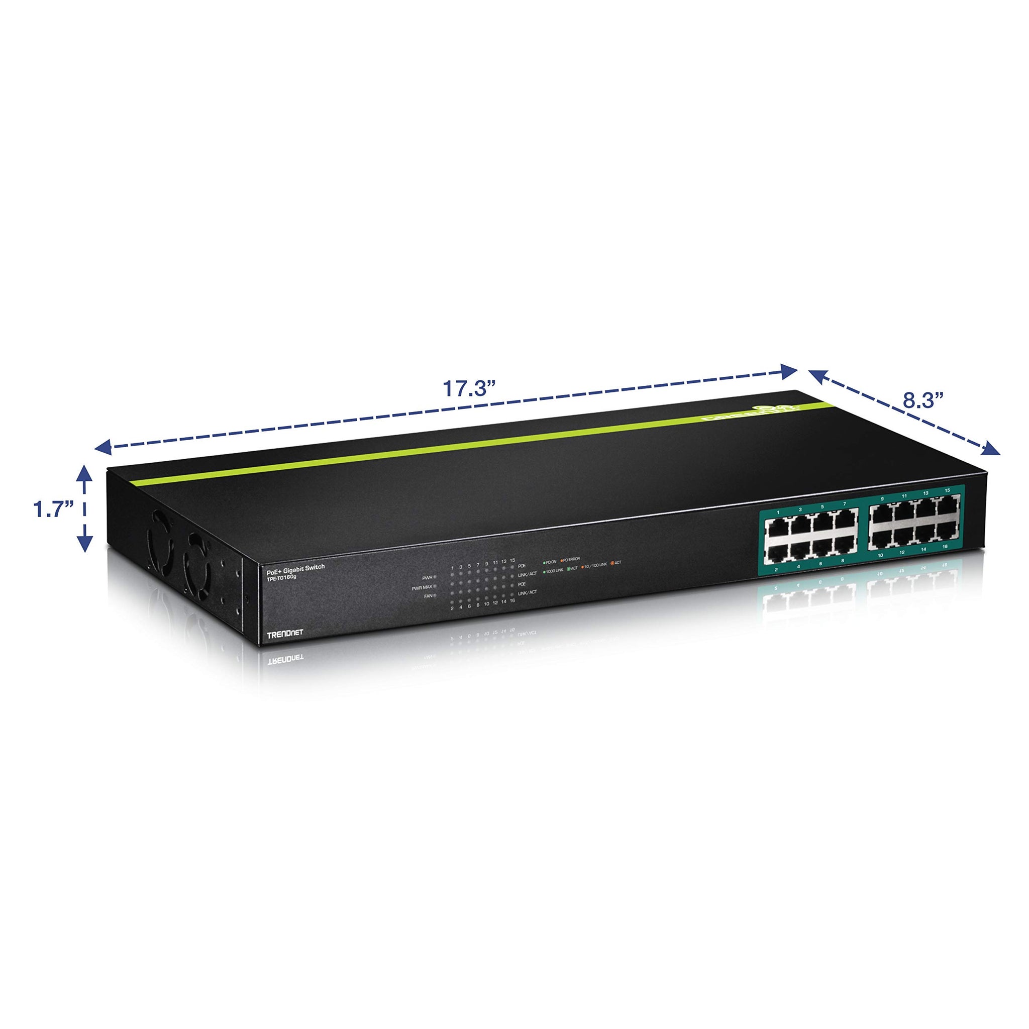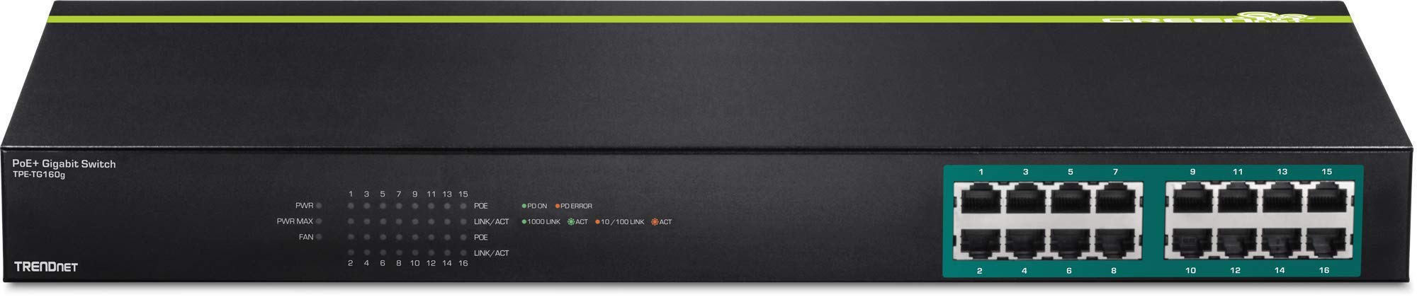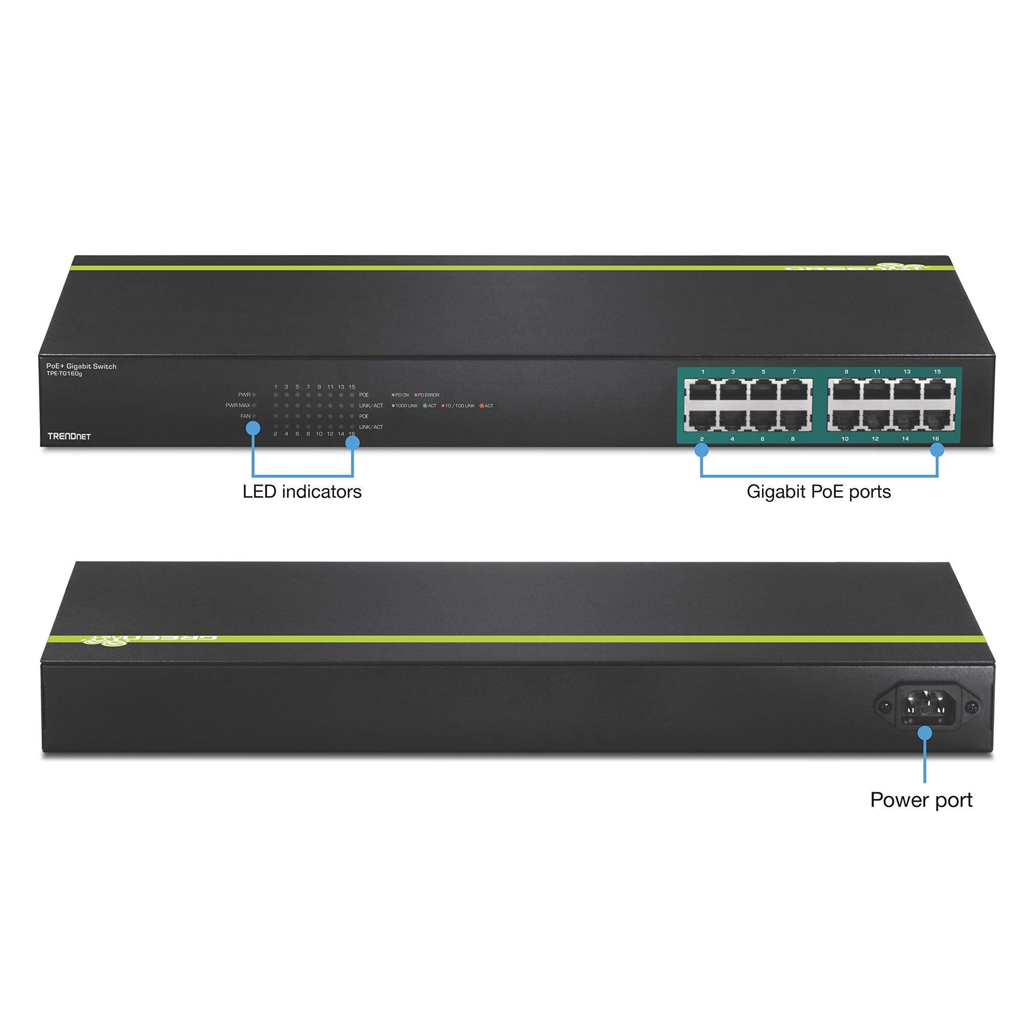 TRENDnet 16-Port Gigabit PoE+ Switch, 16 x Gigabit PoE+ Ports, TPE-TG160g, 246W PoE Power Budget, 32 Gbps Switching Capacity, Desktop Switch, Ethernet Network Switch, Metal, Lifetime Protection