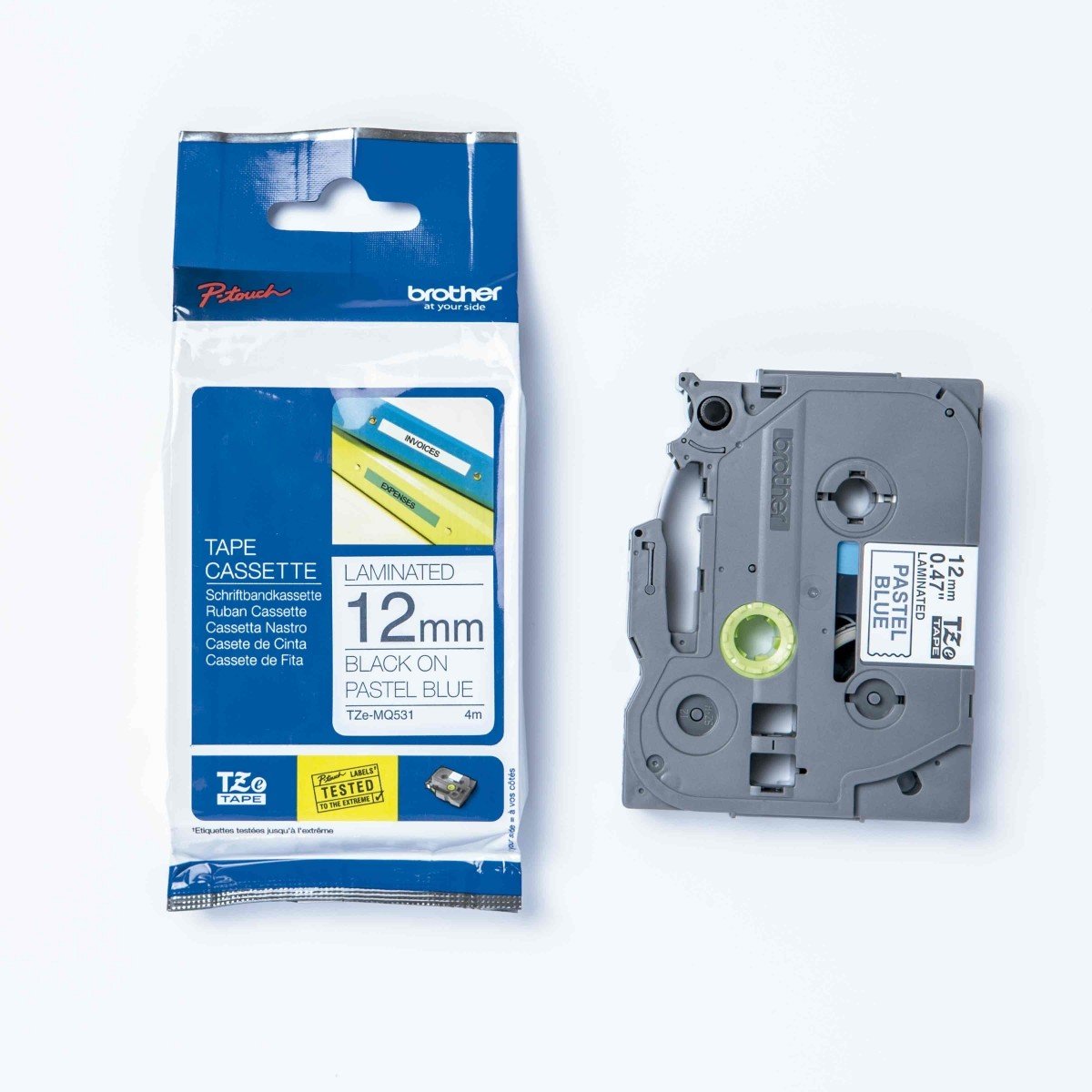 Details: Brother PTouch 1/2" Laminated TZe Tape - 15/32" Width - Pastel Blue, Clear - 1 Each