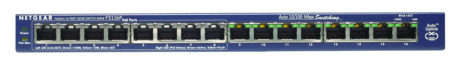 Details: NETGEARs FS116P Fast Ethernet Switch with 8 Port PoE provides your LAN with high-speed, 10/100 Mbps auto-sensing connectivity for as many as 16 users. Just plug in your Ethernet cables, connect a power cord, and youre ready to go theres no software to configure. Engineered without the need for internal fans, they operate silently. And each of these very compact switches is housed in a sturdy metal case for years of dependable use.