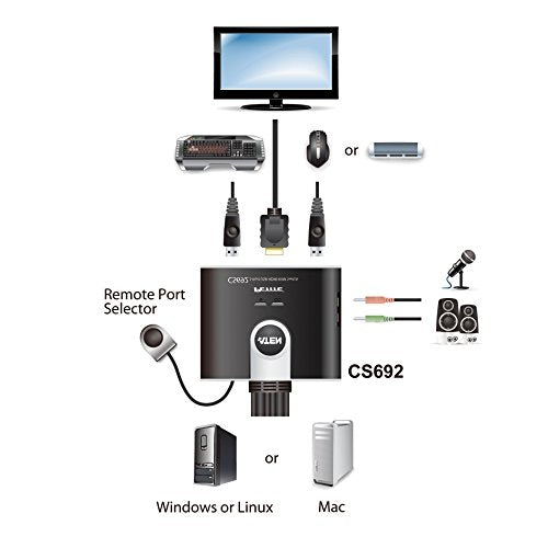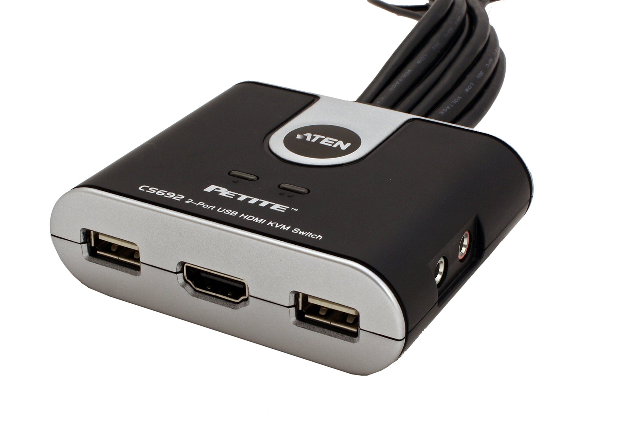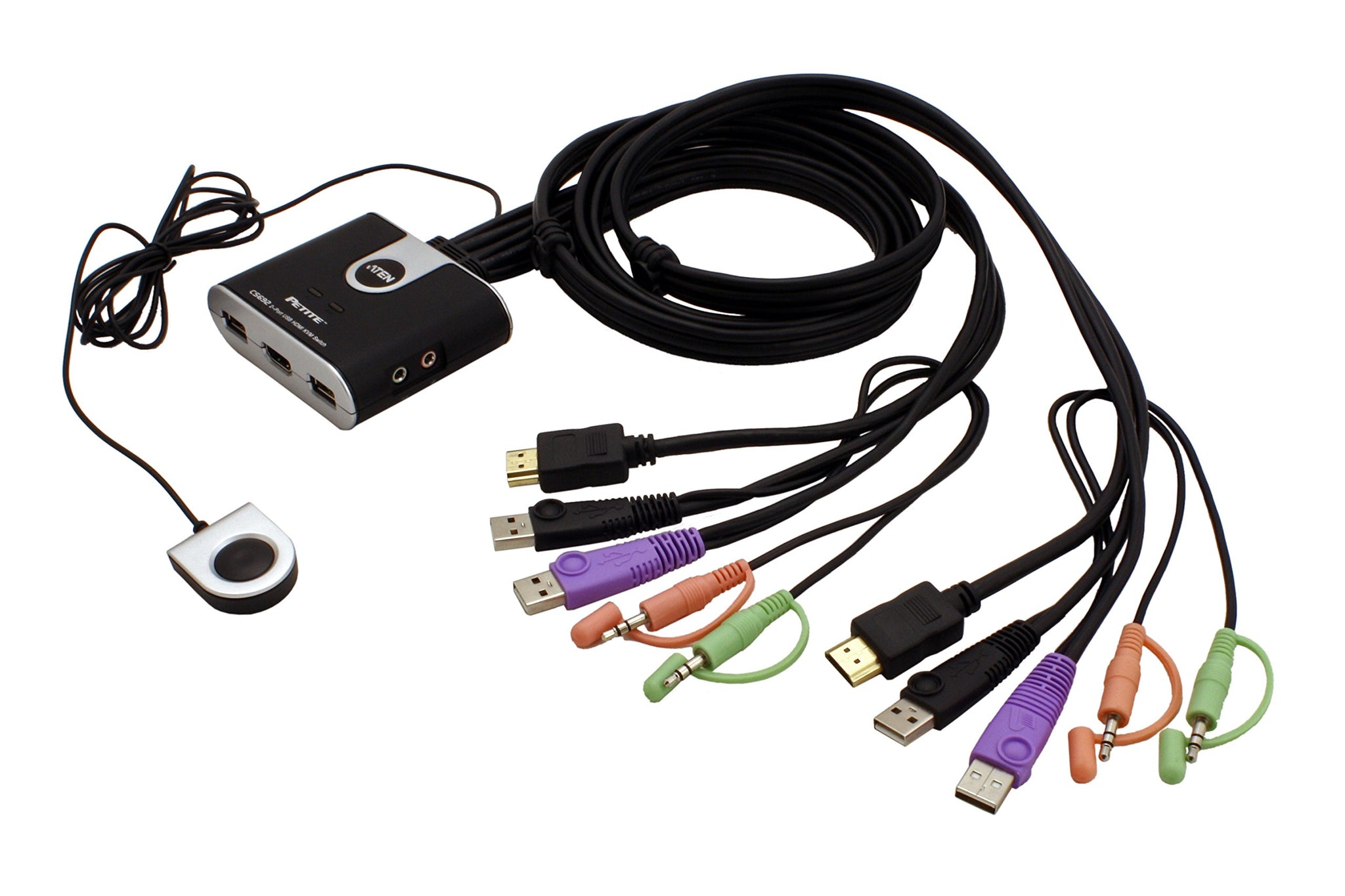 - One HDMI video console controls two HDMI-enabled PCs or devices