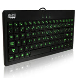 Details: The Adesso AKB-110EB 3 Color Illuminated Mini Keyboard is the perfect for those who find themselves working late at night in dim or dark lighting environments. This keyboard features Illuminated backlit keys in 3 colors: Green, Blue and Red which can be accessed quickly and conveniently with a touch of a button. Dim, brighten or turn of the brightness of your backlit keys easily with the shift key. Measuring less than 12” wide, it is also ideal for POS stations, sales or information kiosks, warehouses or any small working environment.