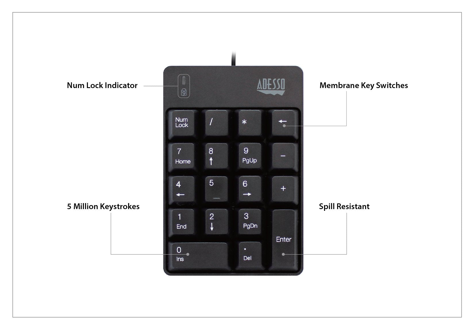 - The keypad's spill resistant design helps to prevent fluids from staying inside, which would otherwise cause damage to the keypad