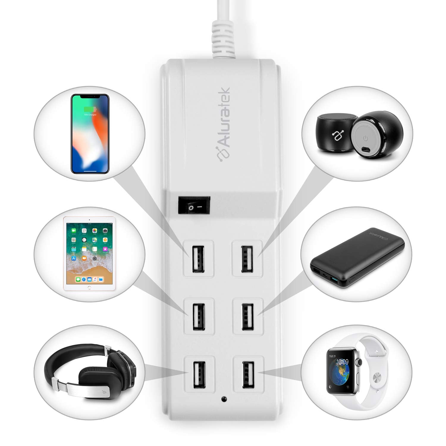 Aluratek AUCS06F 6-Port USB Charging Station and Mini Surge Protector - Retail Packaging - White