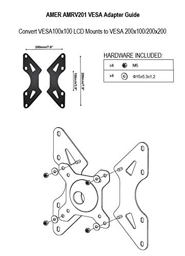Details: This vesa plate is designed to adapt 100x100 VESA Standard mounts to accept larger LCD/LED TV mounts with 200x200 or 200x100 mounting points. The plate is created using high quality rolled steel for strength and durability. All plates are completely powder coated in black for a durable and attractive finish. ~The Amer team is always looking for ways to innovate and provide superior product and services! Note:Hardware is provided in this adapter kit to connect the VESA plates to your 100x100 mount. (mounting screws on the TV/Monitor side not incl. ; should be provided with your mount.)