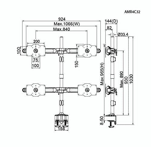 AMER NETWORKS AMR4C32 AMER Mounts Clamp Based Quad Monitor Mount for Four 24"-32" LCD/LED Flat Panel Screens, Black