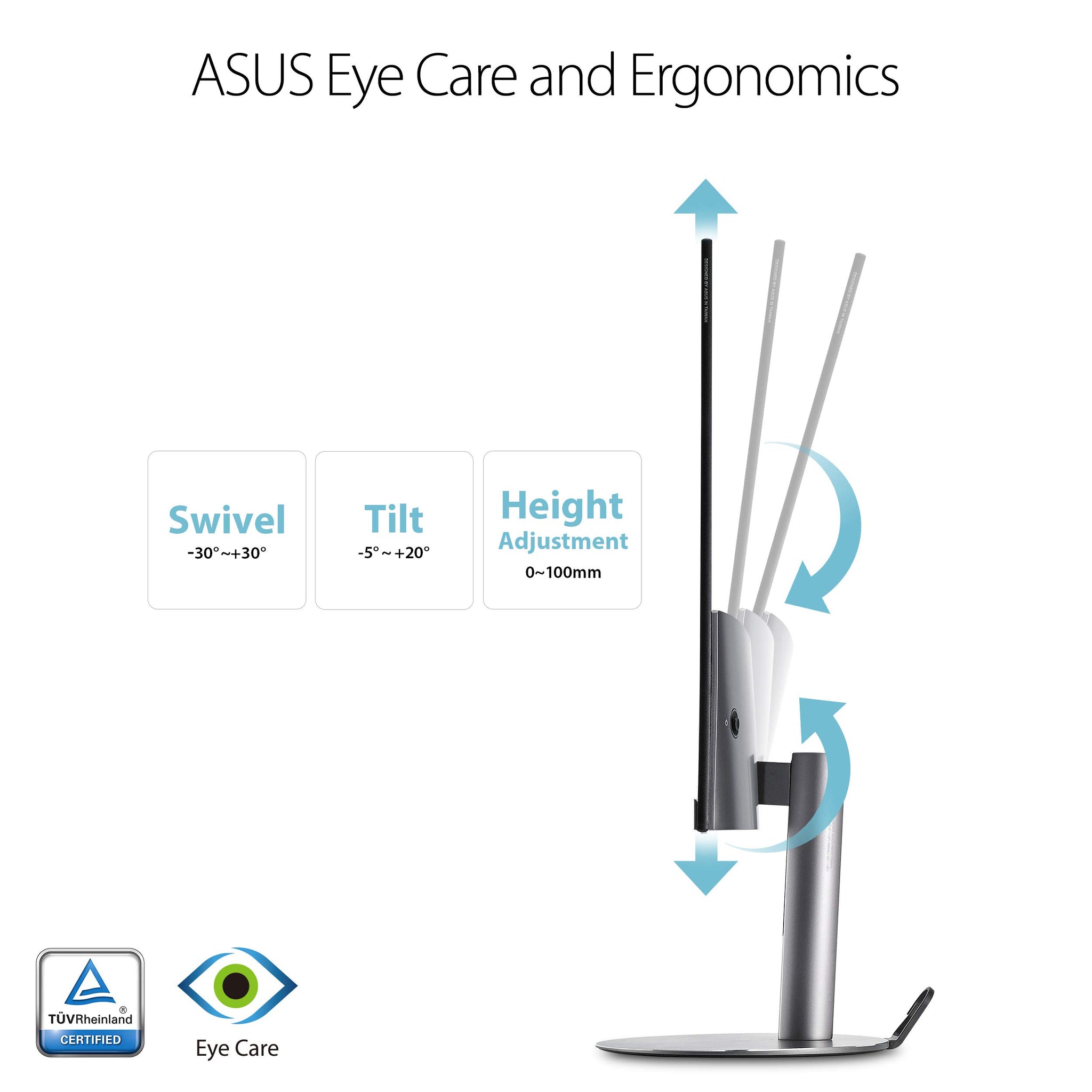 - ASUS Eye Care technology with TUV Rhineland-certified flicker-free backlighting and blue light filter minimizes eye fatigue and ergonomic adjustability with tilt, swivel and height adjustment
