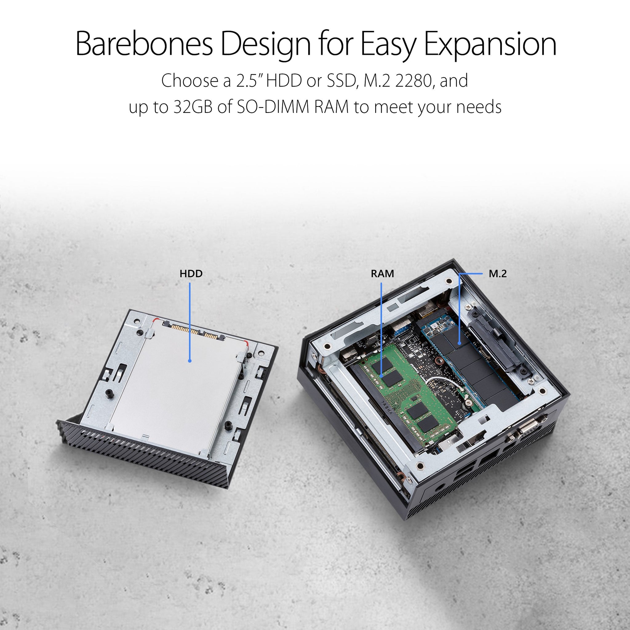 - ASUS PN60-BB3006MC Barebones Mini PC features an Intel Core i3-8130U processor with support for up to 32GB DDR4 memory with 2x SO-DIMM, 1x M.2 SSD, 1x 2.5in SSD/HDD, Gigabit LAN, and 802.11ac Wi-Fi