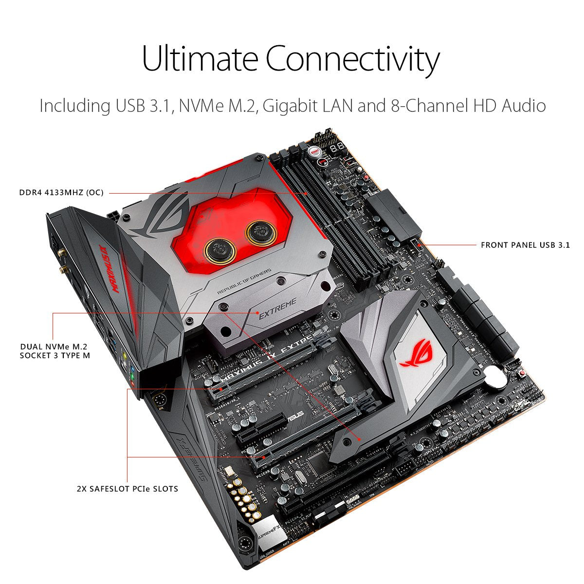 Details: The ROG Maximus IX Extreme is a watercooler's dream, featuring an integrated ROG Bits power mono block with an embedded flow meter, temperature sensor, leak detector, and conductive M. 2 heatsink. Compromise nothing on connectivity and speed performance with front panel USB 3. 1, NVMe M. 2 and on Board 802. 11AC Wi-Fi