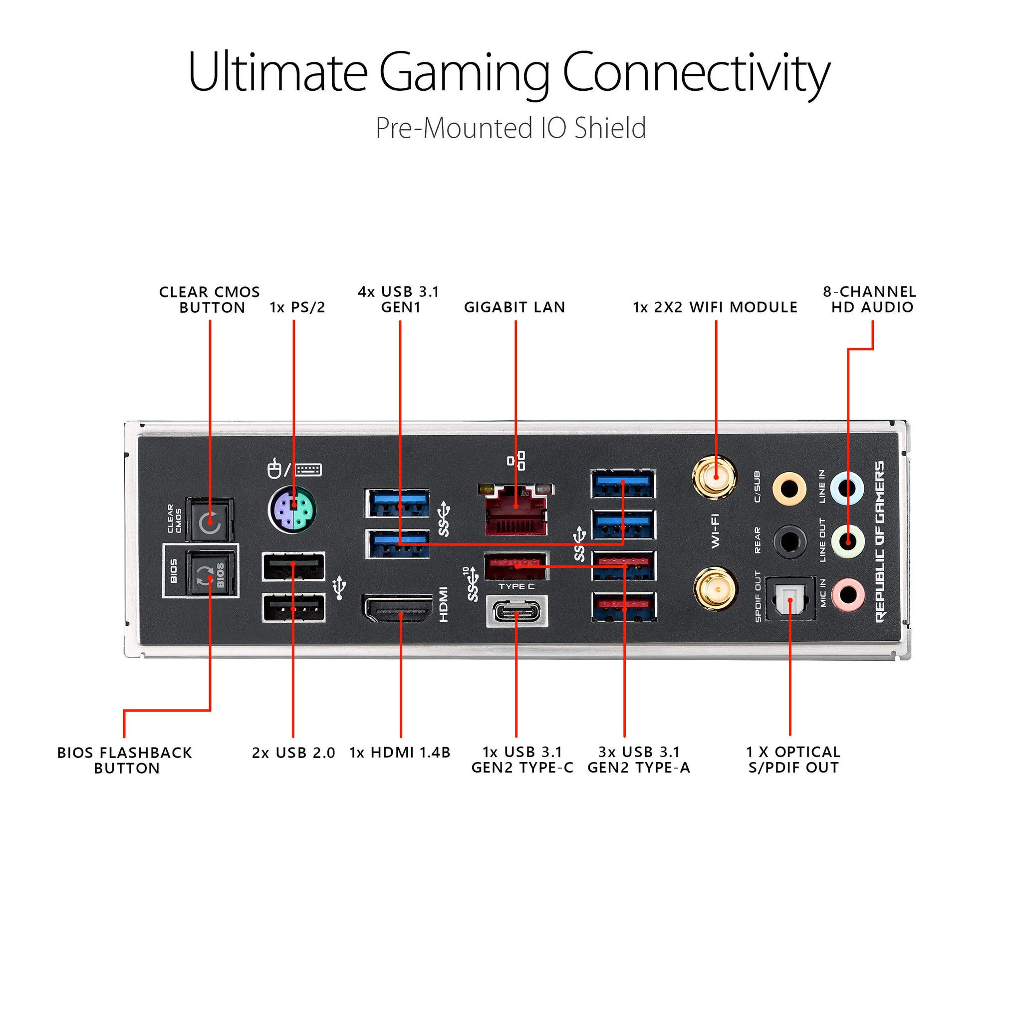 - Pre-mounted I/O shield ensures streamlined installation and represents ROG's attention to detail and quality