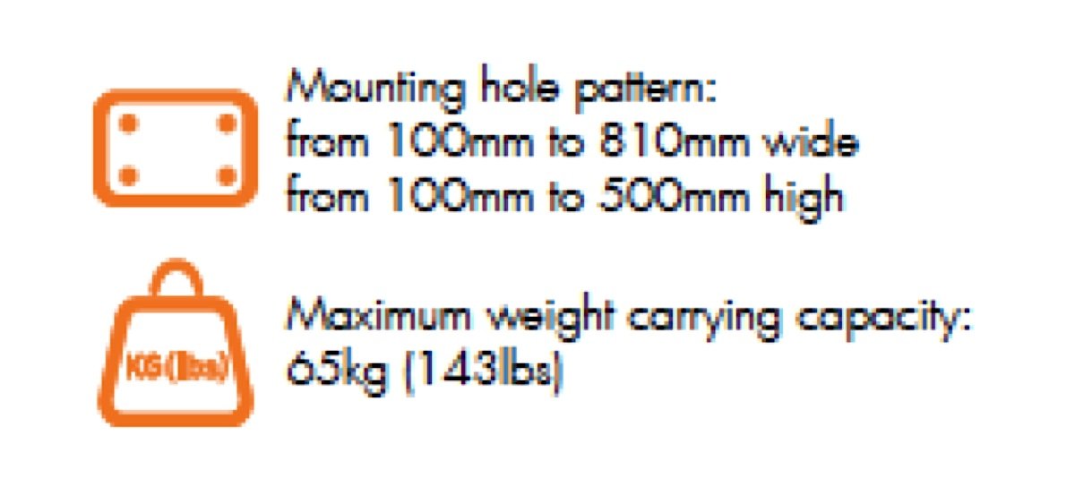 - Designed For Displays Of Up To 65Kg / 143 Pounds With Mounting Patterns From 100x810mm Wide To 100x500mm Wide