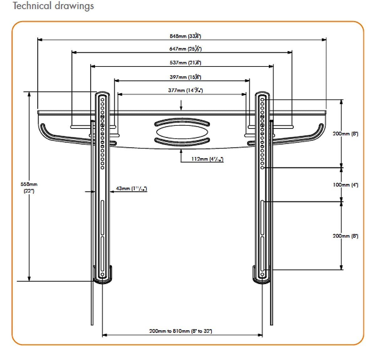 - The wall plate incorporates slotted holes for easy alignment while the brackets allow for horizontal and vertical adjustment post installation