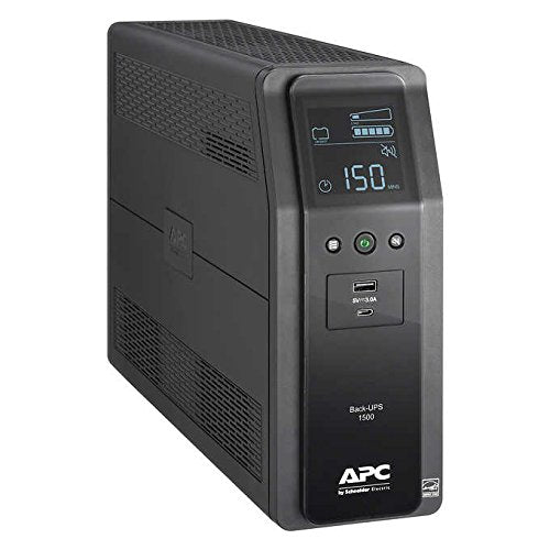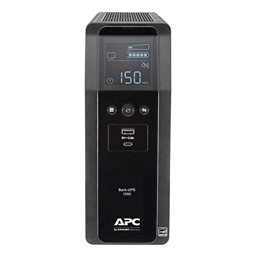 Details: The new APC Back-UPS Pro provides premium battery backup and surge protection for your high-performance and critical devices. The USB charging ports provide convenient charging and back-up power during an extended outage. Active PFC compatibility ensures high end PCs and gaming consoles receive backup power during an extended power outage. The APC Back-UPS Pro 1500 is designed for high performance devices such as a computer, gaming console, home Wi-Fi, VOIP phone system, or entertainment system. Don't let a power outage disrupt your life, stay connected with APC battery backup. Features: 10 power outlets: 6 x battery and surge back up, 4 x surge protection only Active PFC compatibility 2 USB charging ports: 1 x Type-C, 1 x Type-A Large LCD display 1 GB network and coax protection PowerChute Personal Edition software included Guaranteed surge protection Input: Input voltage: 120 V AC nominal Frequency: 60 Hz +/- 3 Hz Cord length: 1.83 m (6 ft.) Input connections: NEMA 5-15P Output: Power capacity: 1500 VA / 900 W Voltage: 115 V AC nominal Frequency -- on battery 60 Hz ± 1 Hz Connections: 10 x NEMA5-15 Protection and Filter: AC surge protection: 1080 joules 1 GB Data line protection: 1-in, 1 out network line - 10/1000 Base-T Ethernet protection, coaxial Specifications: Dimensions (H x W x D): 26.7 cm x 9.9 cm x 36.8 cm (10.5 in. x 3.9 in. x 14.5 in.) Weight: 11.4 kg (25.1 lb.) Warranty: 3 years, $250,000 equipment protection policy