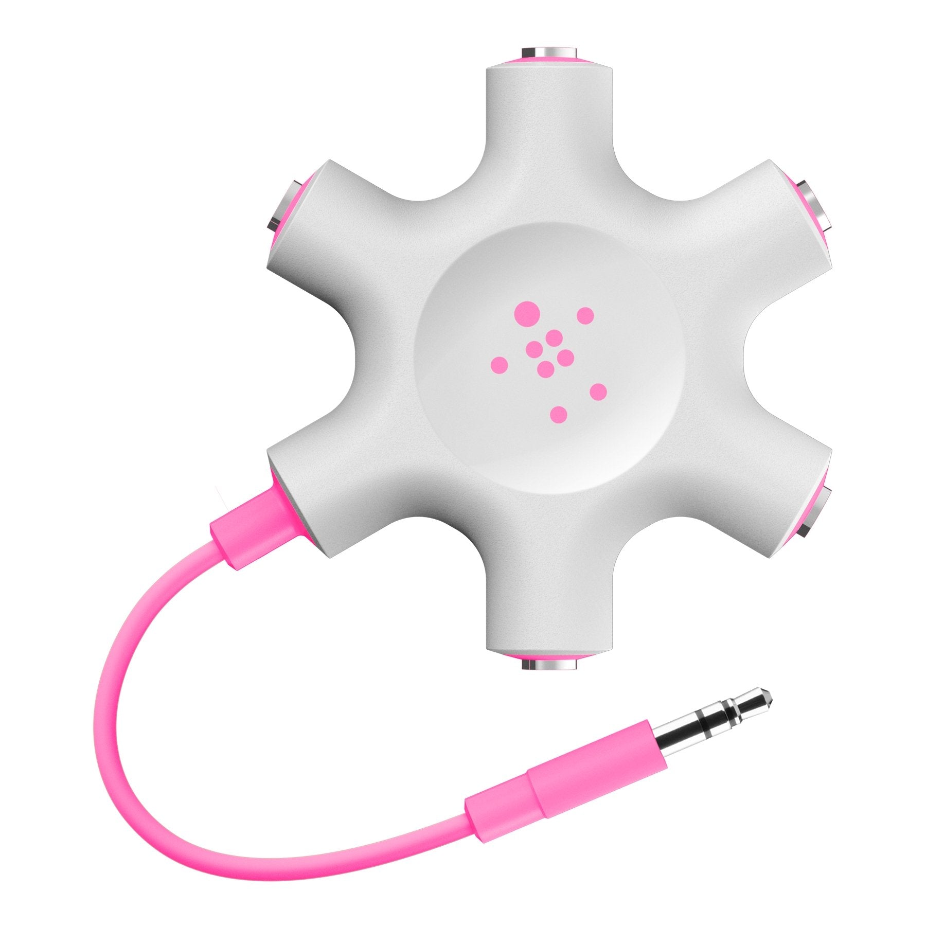 Details: Belkin RockStar Mini-phone Splitter Audio Cable - Mini-phone for Audio Device, iPod, iPhone, iPad, MacBook Air, MacBook Pro, Tablet PC, Headphone, Digital Text Reader, Cellular Phone - Splitter Cable - 1 x Mini-phone Male Audio - 5 x Mini-phone Female Audio - Pink, White