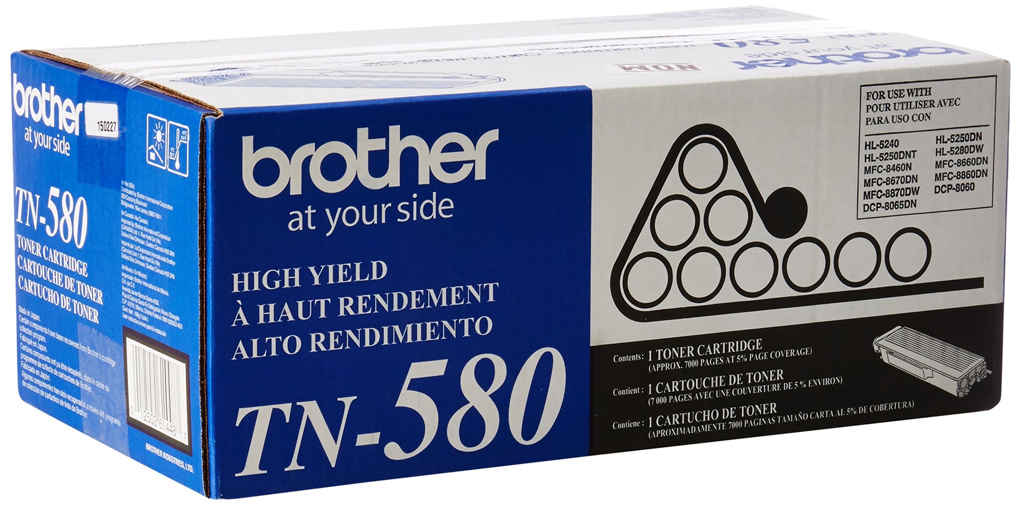 Details: Compatible with Brother printer models HL5200, HL5250DN, HL5240 and HL5280DW, the TN580 toner cartridge easily pops into place and gets you back to printing in just minutes. The unit is a high-yield cartridge, offering an expected yield of 7,000 sheets based on 5% coverage of letter-sized pages. Fine toner particles produce rich black text with precision and clarity. Brother recommends this name-brand cartridge for use as a replacement cartridge. What's in the Box: One TN580 black toner cartridge