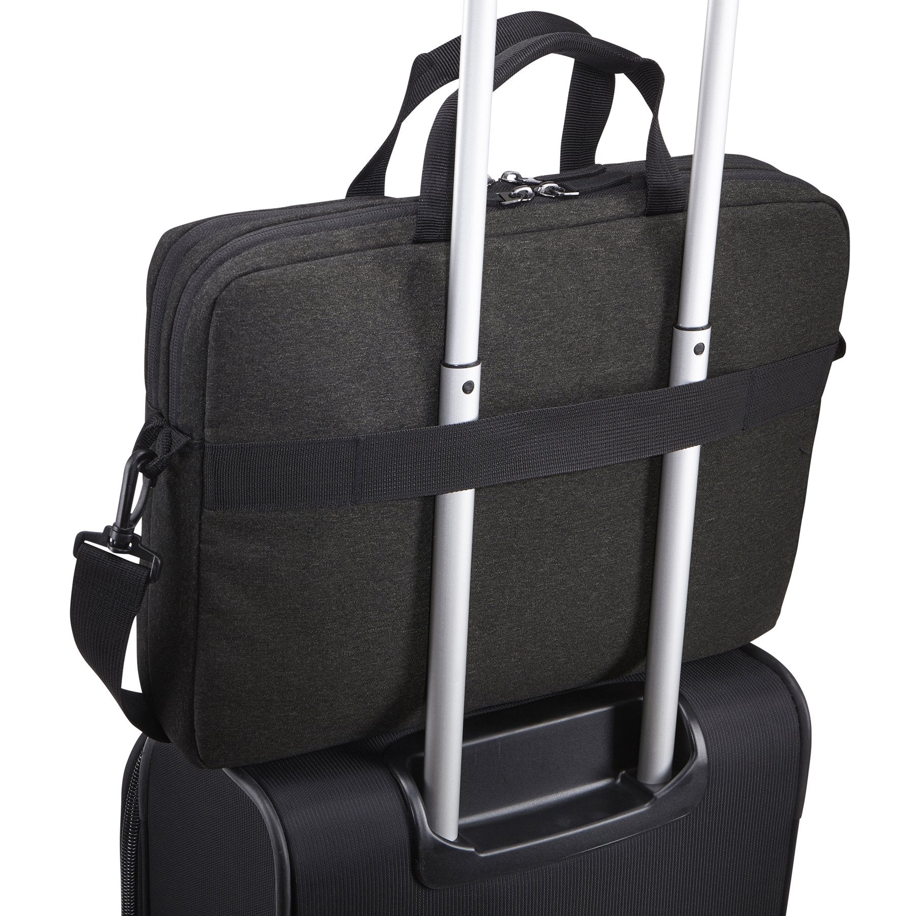 - Luggage strap securely attaches slim case to most rolling luggage