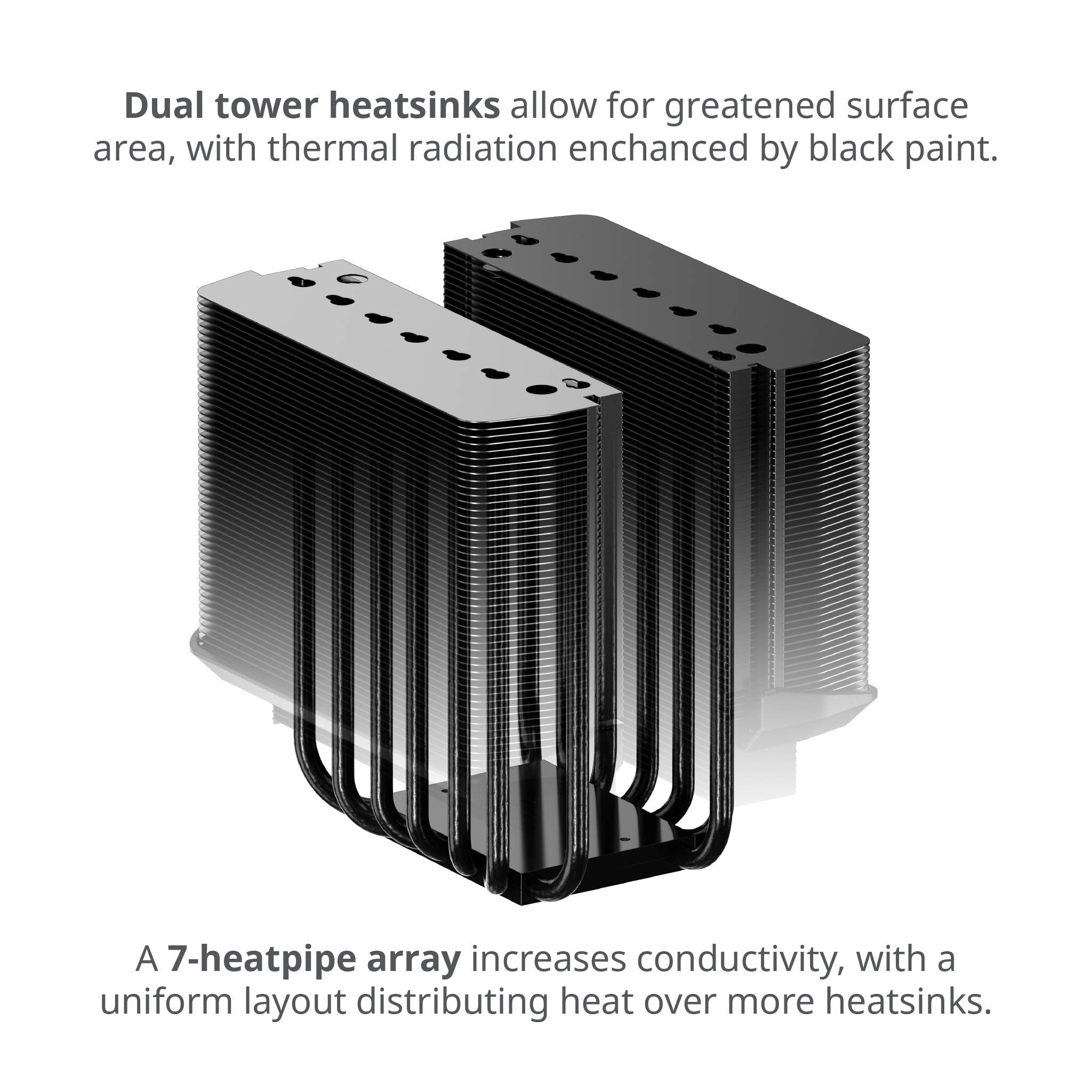 - Dual Tower Heatsink A combination of two sets of heatsink covers more surface area and dissipates heat more efficiently. The jet black paint enhances cooling performance