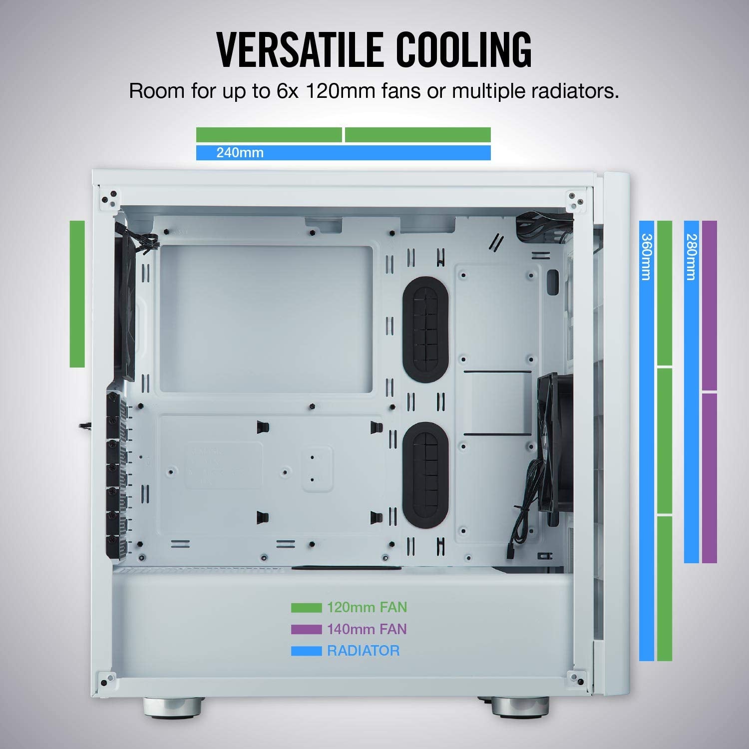 - Versatile cooling options with space for multiple radiator configurations