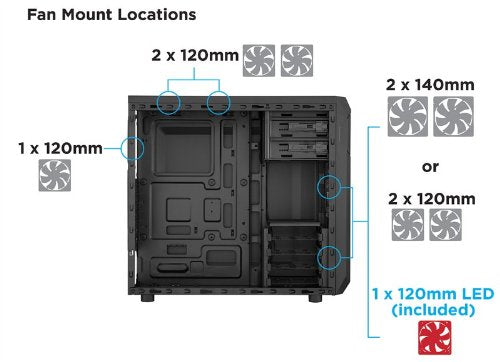 - Tons of fan mounts: Front - 2 x 140/120mm (1 x 120mm LED included) Top - 2 x 120mm Rear - 120mm