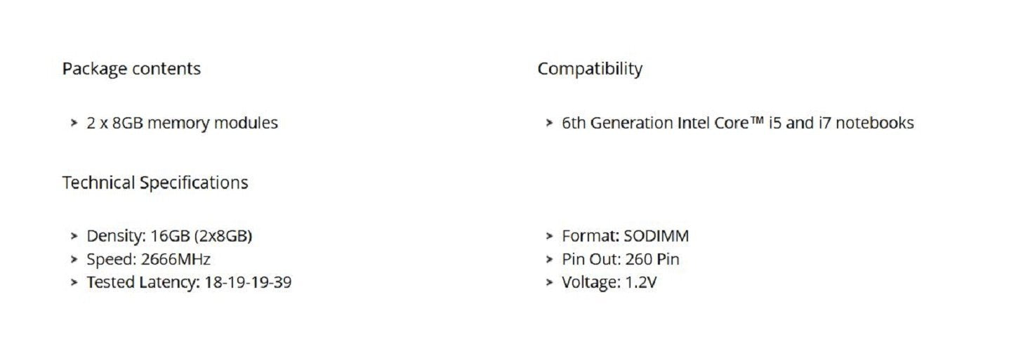 - 16GB (2x8GB) DDR4 SODIMM kit for 6th Generation Intel Core i5 and i7 notebooks