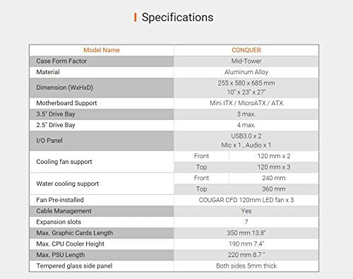 Superior Expandability- In addition, you can showcase your high-end and powerful gaming system including full-size graphics cards up to 350mm with amazing vision beyond your imagination. COUGAR Conquer is an ultimate masterpiece in of your dreams.