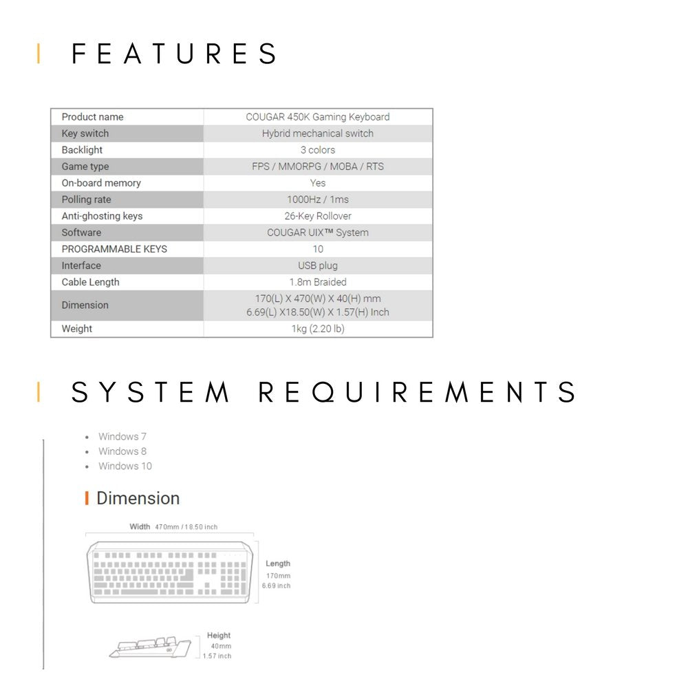 Cougar KBC450-WXNMB 450K Hybrid Mechanical Gaming Keyboard - Splash Proof - Configuration Profiles- 10 programmable Keys