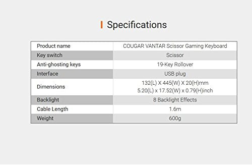 Cougar Vantar RGB Gaming Keyboard-8 Different Lightning Effects - Scissor Switch Mechanism - Silent Keys