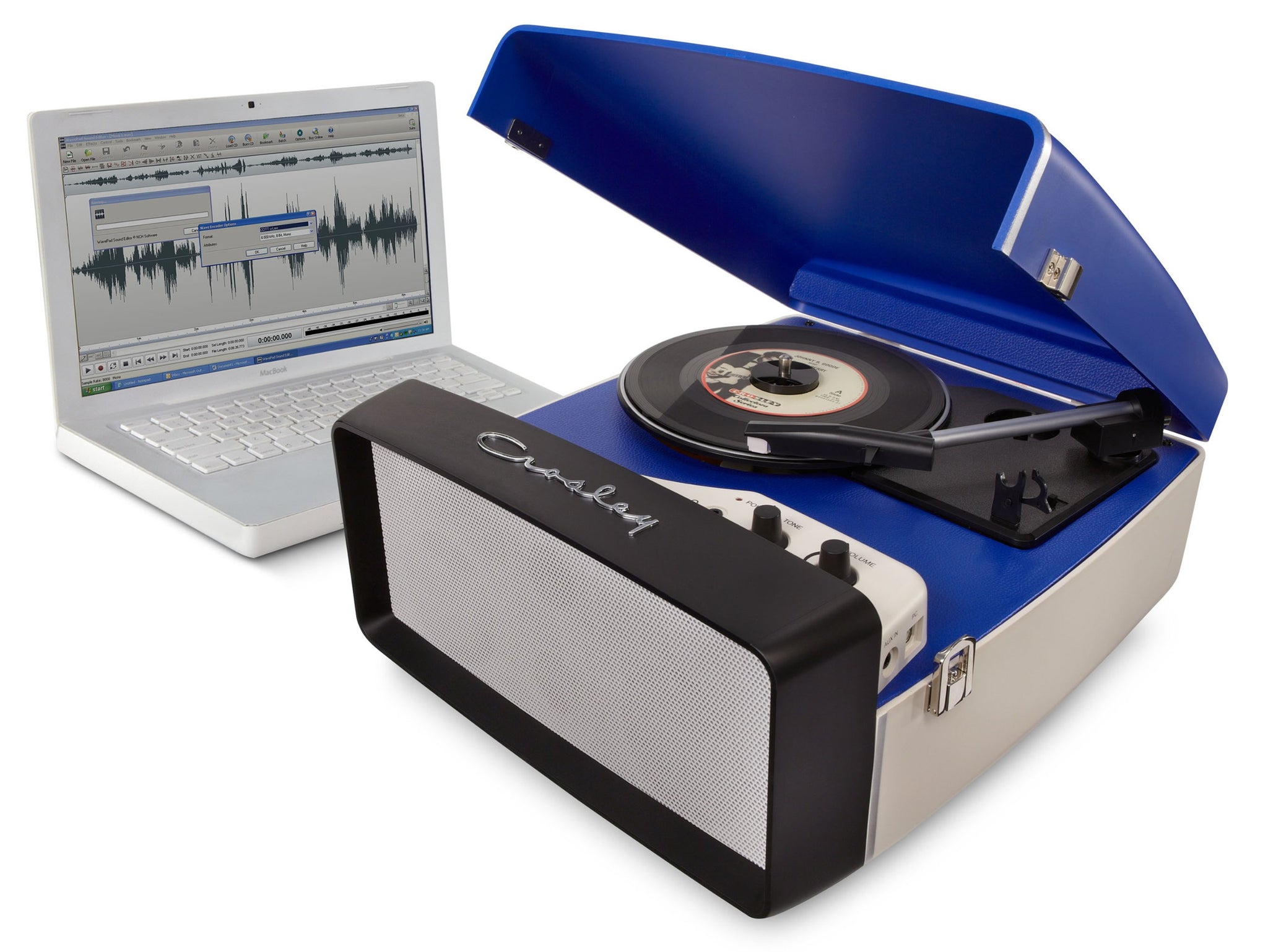 Details: Blue color. Vinyl wrapped. Belt driven turntable mechanism. Diamond stylus needle. Plays three speeds 33.33, 45 and 78 RPM records. Plays 7 in., 10 in. and 12 in. records. Dynamic full range stereo speakers. Headphone jack. USB enabled for connection to Windows equipped PC and Mac. Durable aluminum grill. Full range 5 watt driver(s). 13.75 in. W x 11.13 in. D x 5.38 in. H (6.5 lbs.). Feel like you're stuck in cruise control when you listen to your iPod? Rev up your music experience with Crosley's Collegiate turntable. The Collegiate is easily transportable with a built-in leather handle allowing you to play your favorite vinyl records anywhere you go. Connect the device to your computer through the USB port and use the included software to preserve your records.