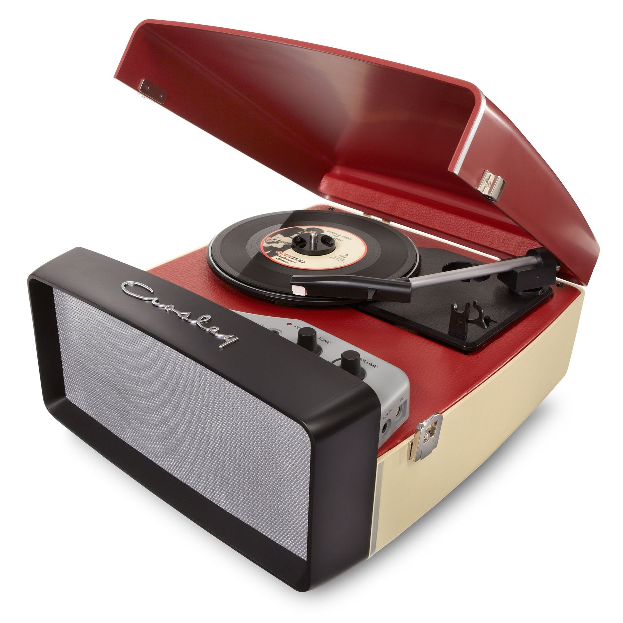 Details: Belt driven turntable mechanism. Diamond Stylus Needle. USB Enabled for connection to Windows equipped PC or Mac. Vinyl Wrapped. Plays 7, 10 and 12 inch records. Dynamic Full Range Stereo Speakers. Headphone Jack. Portable Turntable. Durable Aluminum Grill. Full range 5 watt drivers. Feel like you're stuck in cruise control when you listen to your iPod? Rev up your music experience with Crosley's Collegiate turnable. This retro-inspired, three-speed turntable features a front stereo speaker designed to look like the grill of an automobile. The Collegiate is easily transportable with a built-in leather handle allowing you to play your favorite vinyl records anywhere you go. Connect the device to your computer through the USB port and use the included software to preserve your records