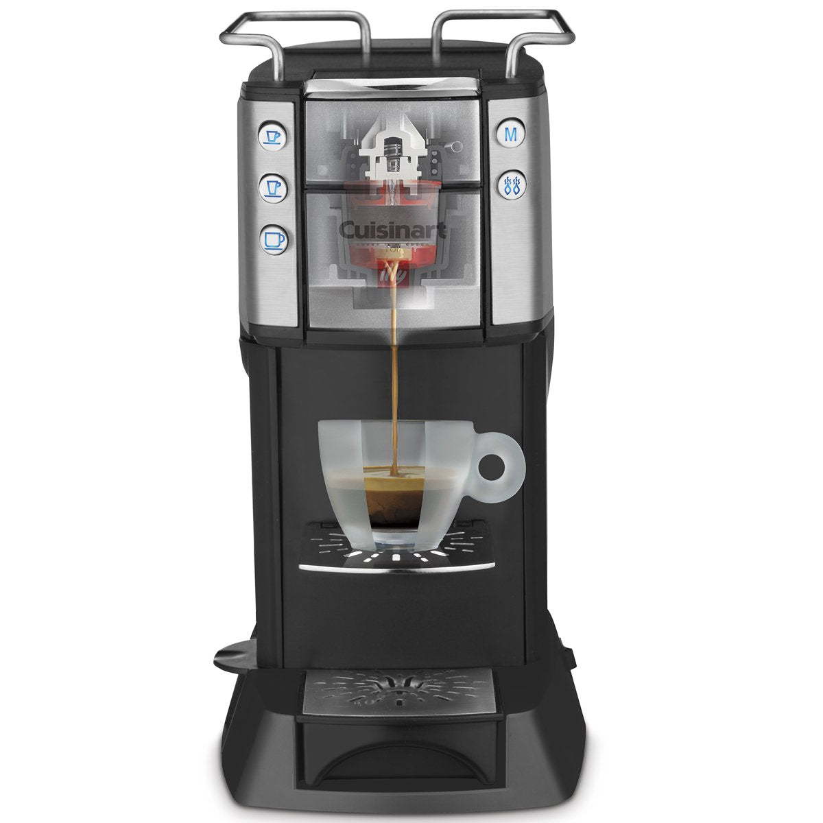 Details: The Cuisinart® Buona Tazza® Single Serve Espresso and Coffee Machine makes extraordinary espresso and freshly brewed coffee at the touch of a button. Created exclusively for the illy® iperEspresso capsule system, the unit offers dual temperatures and adjustable coffee flavour strength. The versatile machine accommodates three cup sizes: Flip-up tray and removable drip tray let you brew directly into demitasse, regular or tall travel mugs. Designed to brew perfect espresso and traditional coffee - every day! 5 Blue LED Controls - Single or double espresso, coffee, custom settings, and temperature 19 Bars of Pressure Stay-Clean Brew Head - Specially designed, sealed capsule keeps brew head clean Removable 1-liter/34-ounce Water Reservoir - for up to 20 short espressos. Used-Capsule Container catches and stores up to 10 capsules. Cup Tray flips down for demitasse cups, folds up to accommodate larger cups. Removable Drip Tray lifts off to fit tall coffee and travel mugs and makes cleanup easy. Cup Warming Plate
