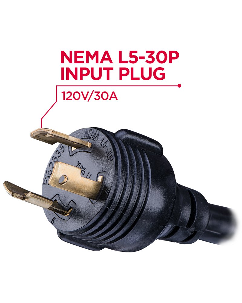 - 7 OUTLETS: 6 NEMA 5-20R, 1 NEMA L5-30R BATTERY BACKUP AND SURGE PROTECTED OUTLETS - INPUT: 120VAC 30A, Plug Type NEMA L5-30P 10 FT Cord