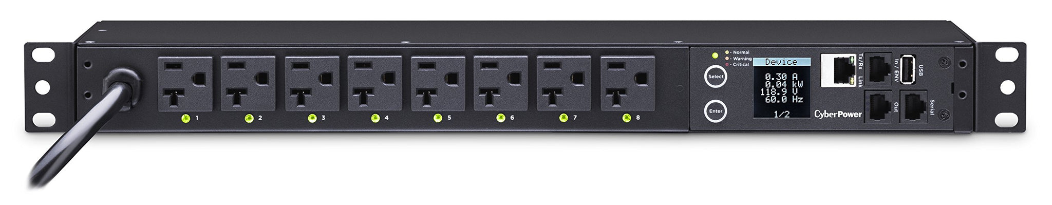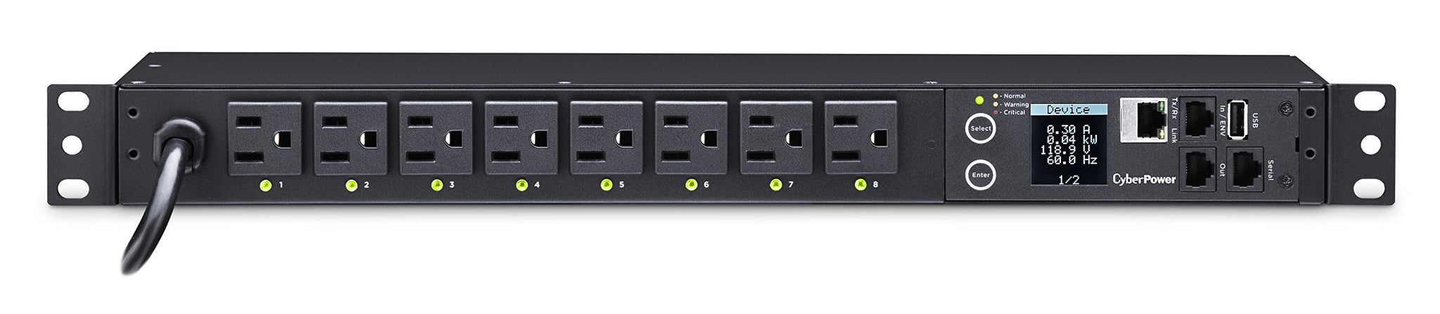 Details: The CyberPower PDU41001, an 8-outlet (front), 1U rackmount switched power distribution unit (PDU), provides 120V 15A output. It distributes power to 8 NEMA 5-15R receptacles from a single NEMA 5-15P plug with unfiltered electrical pass-through. The switched outlet receptacles can be managed individually or collectively over the network, using the CyberPower Management Console, a web browser, and the RJ45 Ethernet port for network connection, or locally by using the LCD controls.