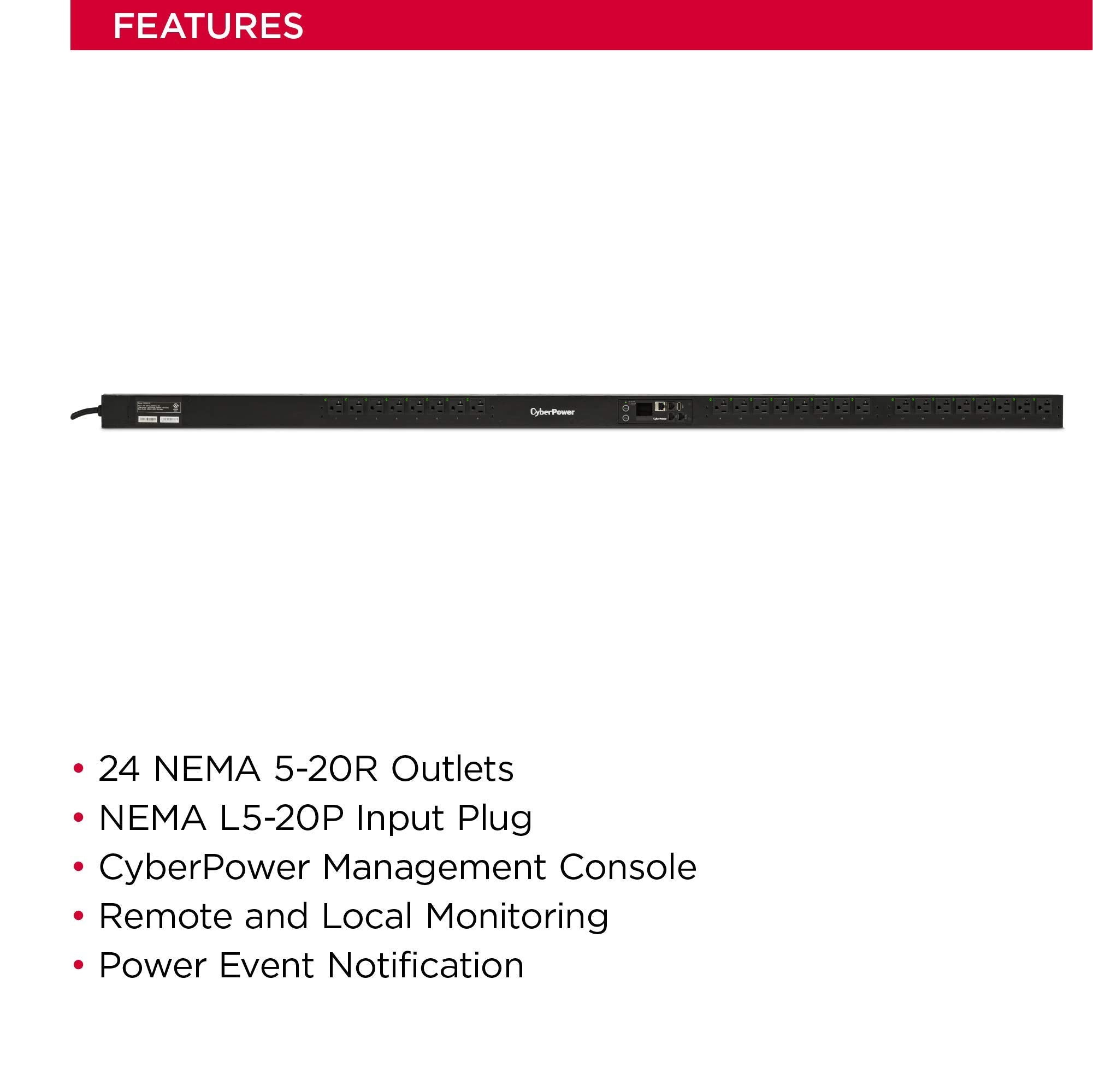 - 24 SWITCHABLE NEMA 5-20R(24 FRONT) OUTLETS: Provides outlet-level power monitoring in real time, along with individual and multiple outlet control
