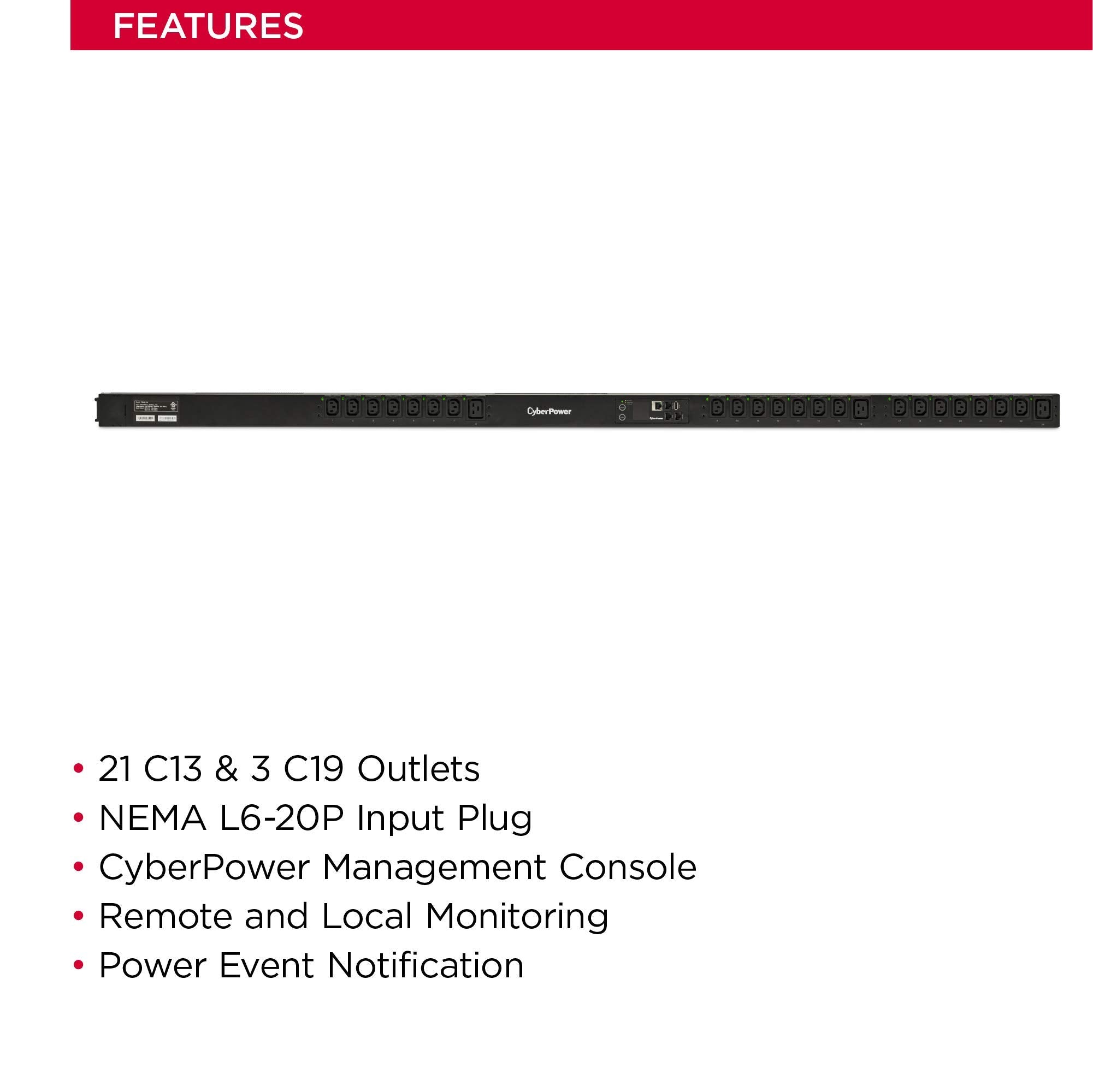 - 24 SWITCHABLE OUTLETS: (21) IEC-320 C13 and (3) IEC-320 C19 outlets provide outlet-level power monitoring in real time, along with individual and multiple outlet control
