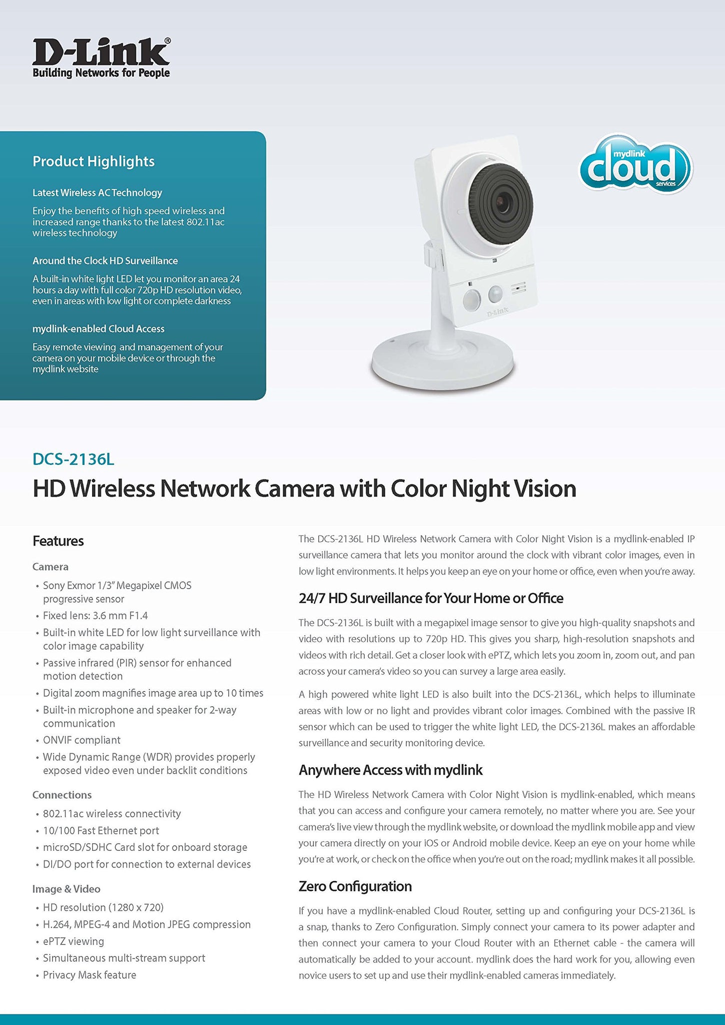 Details: The DCS-2136L Wireless AC Day/Night Camera with Color Night Vision is a mydlink-enabled IP surveillance camera that lets you monitor around the clock with vibrant color images, even in low light environments. It helps you keep an eye on your home or office, even when you’re away. 24/7 HD Surveillance for Your Home or Office: The DCS-2136L is built with a megapixel image sensor to give you high-quality snapshots and video with resolutions up to 720p HD. This gives you sharp, high-resolution snapshots and videos with rich detail. Get a closer look with ePTZ, which lets you zoom in, zoom out, and pan across your camera’s video so you can survey a large area easily. A high powered white light LED is also built into the DCS-2136L, which helps to illuminate areas with low or no light and provides vibrant color images. Combined with the passive IR sensor which can be used to trigger the white light LED, the DCS-2136L makes an affordable surveillance and security monitoring device. Anywhere Access with mydlink: The Wireless AC Day/Night Camera with Color Night Vision is mydlink-enabled, which means that you can access and configure your camera remotely, no matter where you are. See your camera’s live view through the mydlink website, or download the mydlink mobile app and view your camera directly on your iOS or Android mobile device. Keep an eye on your home while you’re at work, or check on the office when you’re out on the road; mydlink makes it all possible.