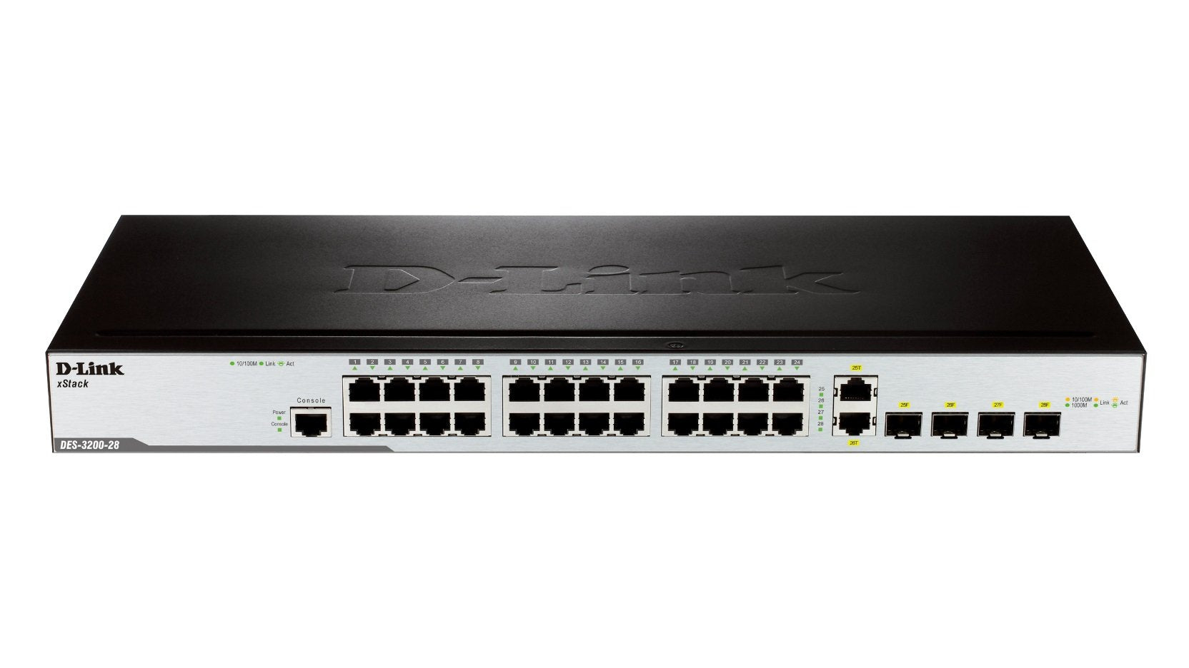 D-Link xStack Managed 24-Port 10/100 Stackable L2 Switch, 2 100/1000 SFP Ports + 2 Combo SFP Slots (DES-3200-28)