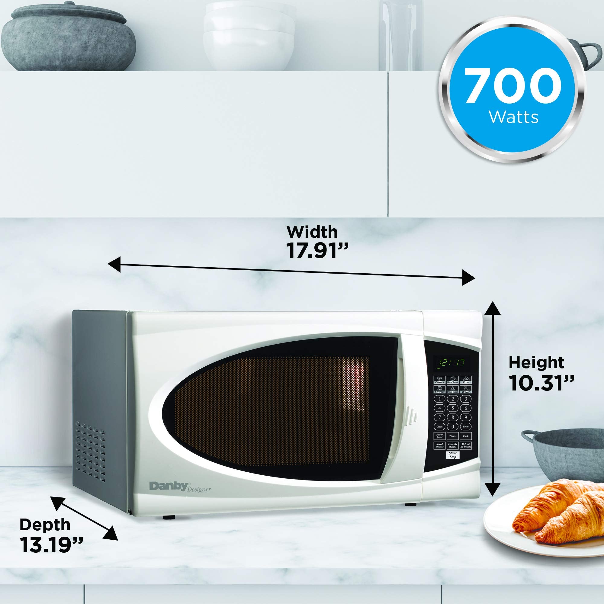 Details: Danby microwaves for the counter top are not only practical and economical, they're stylish too! Available with a variety of today's most popular features. Danby microwaves are well suited for the dorm room, office, cottage or kitchen. 0.7 cu. ft. capacity microwave 700 watts of cooking power Oval door design Electronic controls 10 power levels Simple one touch cooking for 6 popular uses (frozen dinner, beverage, popcorn, potato, pizza, reheat) Easy to read LED timer/clock Automatic oven light and turntable This Danby Microwave features 3 specialty programs Cook by weight Defrost by weight Speed defrost