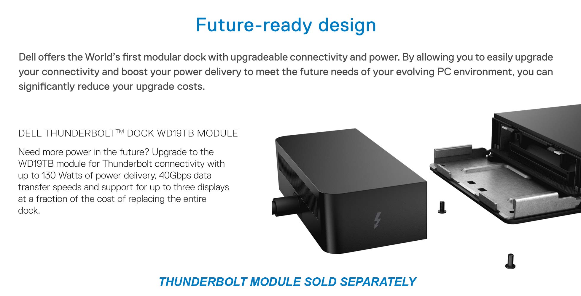 Details: Dell WD19 Docking Station with 180W AC Power Adapter (130W Power Delivery) – Boost your PC’s power on the world’s most powerful and first modular dock with a future-ready design. Recommended and Compatible Dell Systems: Latitude Series: 3301, 3390, 3400, 3490, 3500, 3590, 5280, 5285, 5290, 5300, 5400, 5401, 5480, 5490, 5491, 5500, 5501, 5580, 5590, 5591, 7200, 7280, 7285, 7300, 7380, 7389, 7390, 7400, 7480, 7490. Precision Series: 3520, 3530, 3540, 3541, 5520, 5530, 5540. The following are compatible but may also require that the laptop be plugged into a power supply; 7520, 7530, 7540, 7720, 7730, 7740. Rugged Series: 5420, 5424, 7424. XPS Series: 9360, 9365, 9370, 9380, 9530, 9560, 9570, 9575. Note: This docking station includes a 180W power adapter, but only delivers 130W of power to the laptop due to the power requirements of the dock itself. If your laptop requires more than 130W of power to run, you may need to have a power supply connected to the laptop. For the best experience with Precision 7530 or 7730, choose the Dell Performance Dock WD19DC which comes with a dual USB-C connector that provides up to 210W power delivery, so you no longer need an additional power adapter). Built for the future. Mix and match: Evolve as your needs change with our most versatile dock. The future-ready design lets you swap out modules with ease if you need to do field replacements or upgrade your systems. Ultimate connectivity: USB-C connectivity makes it easier than ever to deliver power, data, audio and video in one con