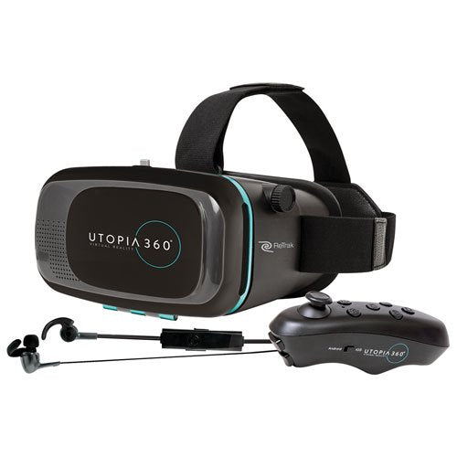 Details: The Utopia ReTrak 360° 3D Virtual Reality Headset Bundle creates an immersive experience that takes virtual reality to a new level. A built-in action button ensures maximum app compatibility through Google Play and the App Store, and the ultra-compatible headset works with nearly all smartphones and iPod Touch. The ventilated form-fit cushion provides a comfortable custom-fit feel for long gaming sessions. Powered by your device, the headset requires no batteries. The bundle includes a Bluetooth remote and wireless Bluetooth earbuds so you can navigate virtual worlds while being immersed in high-definition audio. Product Features: Built-in action button ensures maximum app compatibility through Google Play and App Store Ultra-compatible headset works with virtually all smartphones and iPod Touch Ventilated, form-fit cushion for comfortable, custom-fit feel Sliding cover for use with augmented reality Dual adjustable focus maximizes clarity Lucidview Lens System with anti-glare lens reduces eye strain Powered by your device with no batteries needed to use headset Rapid charge cable to charge earbuds with retractable micro USB cable Bluetooth controller has 8 buttons and joystick Controller requires 2/AAA batteries (not included) Includes VR headset, wireless Bluetooth earbuds, Bluetooth controller, micro USB cable and carrying bag Warranty: 1 year
