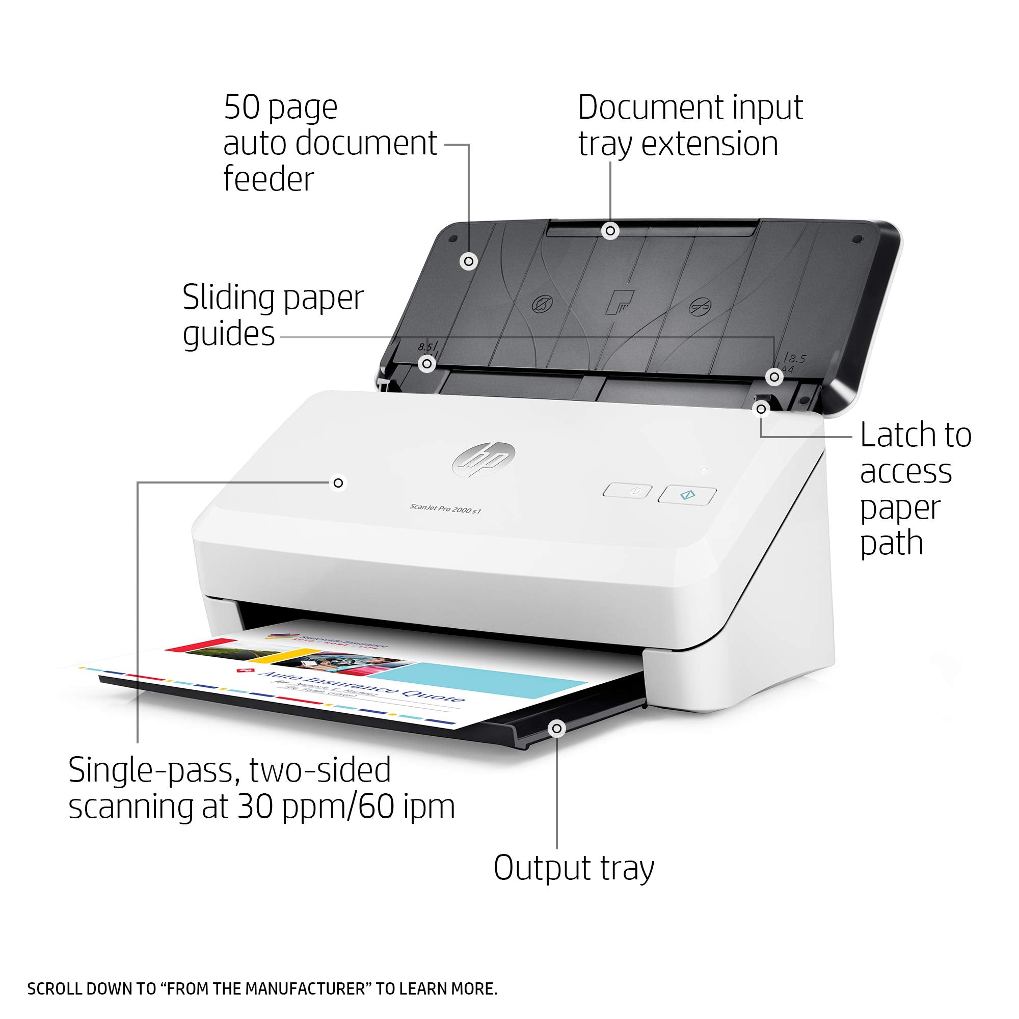Details: Fast, affordable, and designed to handle everything from simple color jobs to complex workflows. Quickly and reliably digitize larger projects with scan speeds up to 30 ppm/60 ipm and a 50-page ADF. Recommended for 2, 000 pages per day. Small size. Fast scans. Same reliable results: Produce scans at up to 30 ppm/60 ipm with two-sided scanning that captures both sides at once. Free up space for work. This HP ScanJet Pro is small and slim—a modern design perfect for the desktop. Don’t wait for warm-up—HP Instant-on Scanning lets you begin scanning quickly. Load up to 50 pages into the automatic document feeder for fast, unattended scanning. Optimize workflows with one-touch scanning: Streamline routine work with one-touch scanning—create one-button, custom settings for recurring scan jobs. Scan images directly into applications with included and full-featured TWAIN and ISIS (R). Easily transfer scans into editable text, secure PDF files, and more file types, using built-in OCR. Quickly share or archive scans directly to popular cloud destinations with HP Scan software. Capture business documents like a pro: Define scan profiles for common document types, and scan to multiple destinations with HP Scan software. Capture and organize documents, business cards, and other file types with feature-rich software. Produce clear, legible scans—up to 600-dpi resolution.