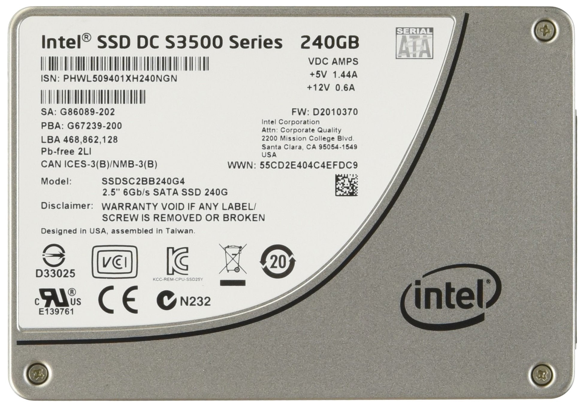 Details: The Intel DC S3500 Series 240GB 2.5" Internal Solid State Drive features a 240GB storage capacity designed for consistent data read speeds of 500 MB/s and data write speeds of 260 MB/s. Along with enhanced data read and write speeds you also benefit from enhanced 75,000 IOPS random read and 7,500 IOPS random write speeds ensuring data can be retrieved quickly and efficiently from anywhere on the drive. These enhanced data speeds make this the perfect drive for video conferencing, big data analytics, virtual client applications and more as it provides enhanced quality of service with low active power levels. Full End-to-End Data Protection Protect your data from the time it enters the drive to the time it leaves. The Intel SSD DC S5300 Series uses an advance error correction scheme that ensures data integrity by protecting against possible data corruption in the NAND, SRAM and DRAM memory. The Intel SSD S3500 Series also protects the data in transit through several techniques such as parity checks, Cyclic Redundancy Checks (CRC) and LB tag validation. Once an error is detected, an immediate attempt will be made to correct it and any uncorrectable error will be reported to the host. To further improve data assurance, the Intel SSD DC S3500 Series provides data redundancy technology to minimize potential data loss. Enhanced Power-Loss Data Protection Reduce potential data loss by detecting and protecting data from unexpected system power