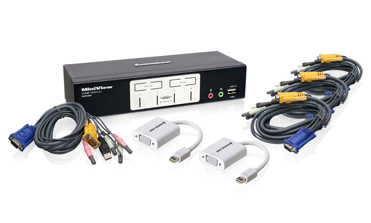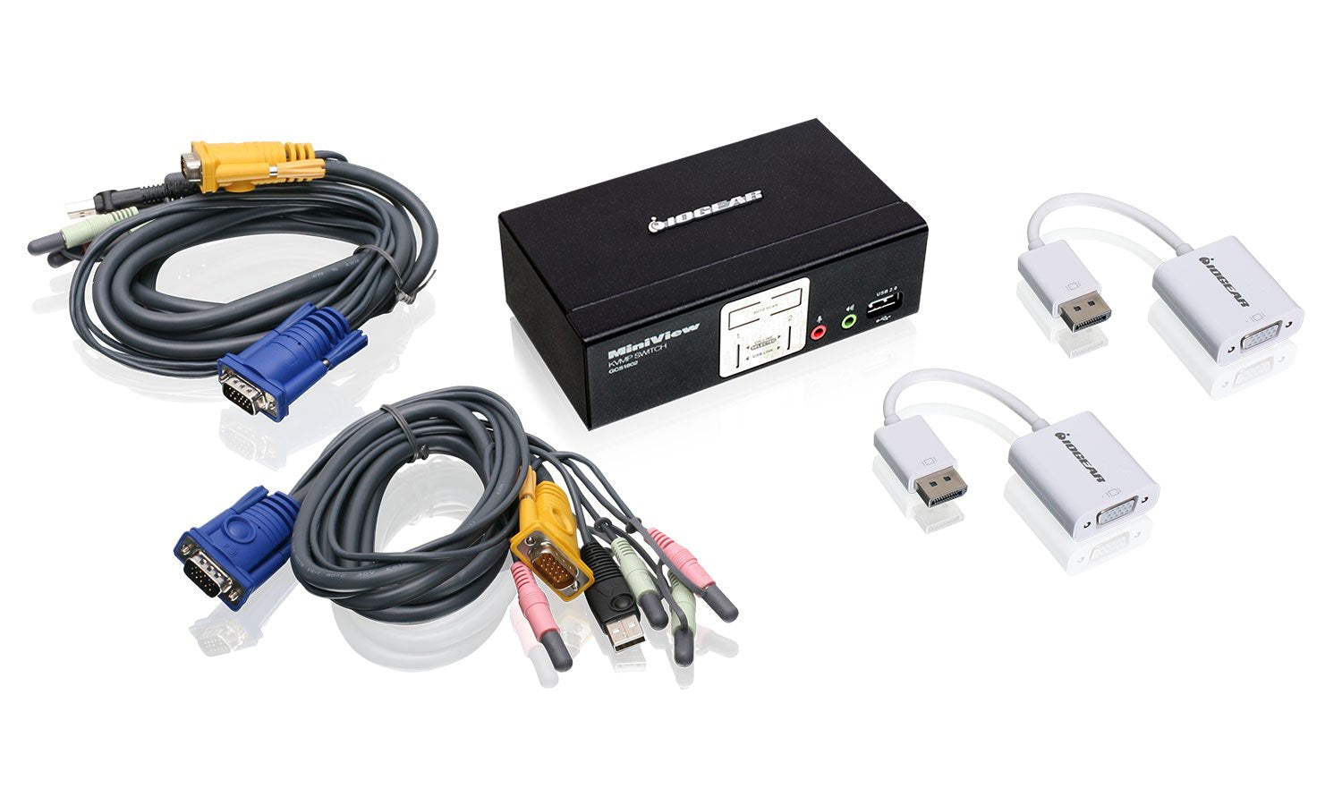 Details: Flexibility to Choose VGA and/or Mini DisplayPort You finally have the flexibility to mix and match your video options with this kit, streamlining and developing efficient workstations by eliminating multiple desktop setups. With the included adapters, IOGEAR's VGA and Mini DisplayPort KVM Solution simplifies the method of sharing four computers using one VGA monitor, keyboard and mouse. This bundle is perfect for a home office or small/medium size business, as it offers the flexibility of choosing between VGA and/or Mini DisplayPort connections. Take advantage of your existing Mini DisplayPort computers, and use the included adapters to view your content on a VGA projector, monitor, or display. Connect your Mini DisplayPort or Thunderbolt enabled Apple MacBook, MacBook Pro, MacBook Air, iMac, Microsoft Surface or Microsoft Surface Pro to any external VGA based high resolution display, projector or TV.Plug-N-Play Switching Switch and control any of the four connected computers easily via push button, hotkey combination, or OSD (On Screen Display). This 4-Port VGA - Mini DisplayPort switch comes with power adapter and supports USB hot-plugging, making it easy to add or remove USB computers connected to the KVM. Expand your USB peripheral sharing by using the built-in USB 2.0 ports. This VGA - Mini DisplayPort KVM bundle supports video resolution up to 1920 x 1200 @ 60Hz, giving users excellent, crisp images on the screen every time. Ease-of-Use With all cables included, no software installation required, this KVM switch bundle is a straight out-of-the-box solution. IOGEAR's 4-Port USB VGA and Mini DisplayPort KVM bundle is a true Plug-N-Play solution to your connectivity needs! This VGA KVM Switch also offers a cost-effective solution to increase productivity by allowing users to switch between the Internet and Intranet with connected PCs.*IOGEAR's DynaSync provides the EDID support for Windows 7**PS/2 KVM Cables are available and sold separately.*** PC keyboard comb