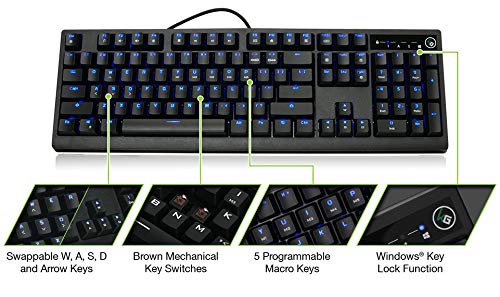 - Blue led backlight with 6 lighting patterns w-a-s-d key functions swappable with arrow keys for MMO gamers