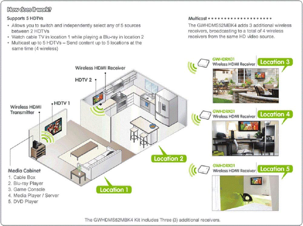 - Multicast up to 5 HDTVs - Send content up to 5 locations at the same time (4 wireless)