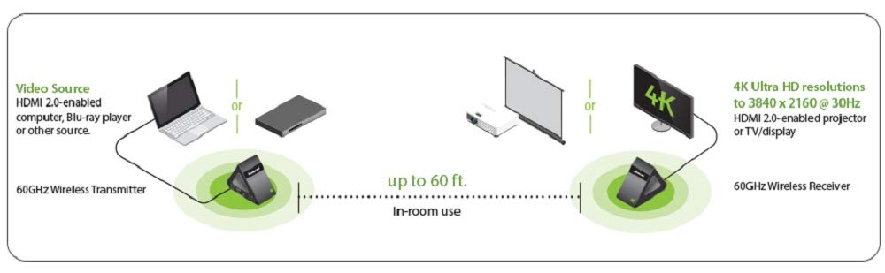 - Wirelessly send 4K UHD video from one HDMI source to one HDMI TV/projector