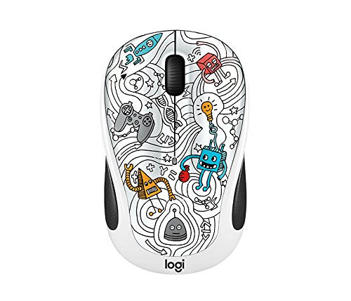 Details: A Logitech Doodle Collection M325c Wireless Mouse takes you far away from the everyday. All the way to your happy place. Choose from doodle designs that reflect your creativity. Lasts up to 18 months on a single battery. Responds up to 33 ft. (10m) with a nano wireless receiver. Rips through web pages and docs with precision scrolling. Brainstorm Teal Design